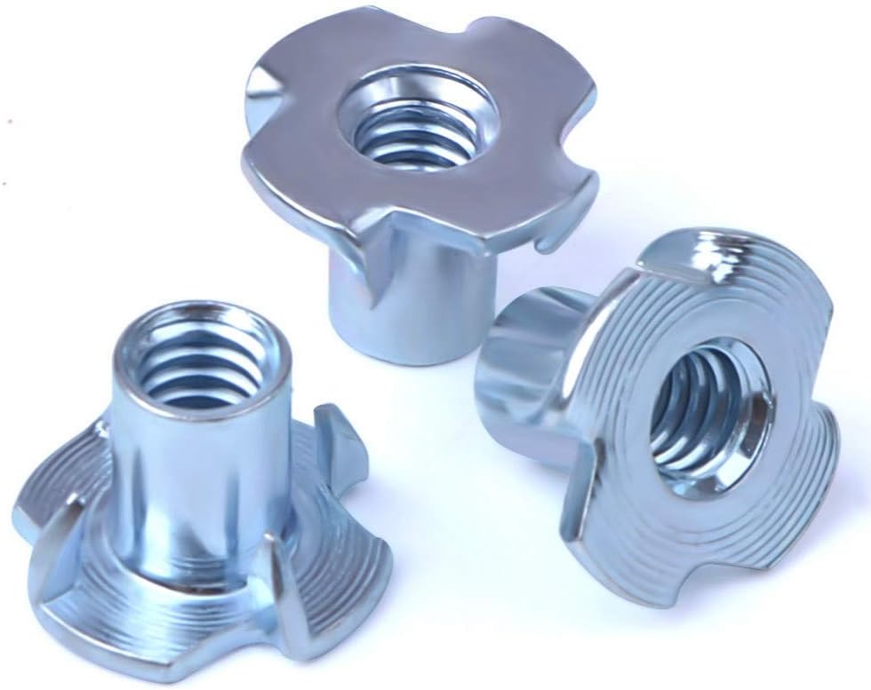 ➤The four pronged T-nuts blind inserts nut are made of zinc plated carbon steel; they have good rust resistance and the excellent of durability.