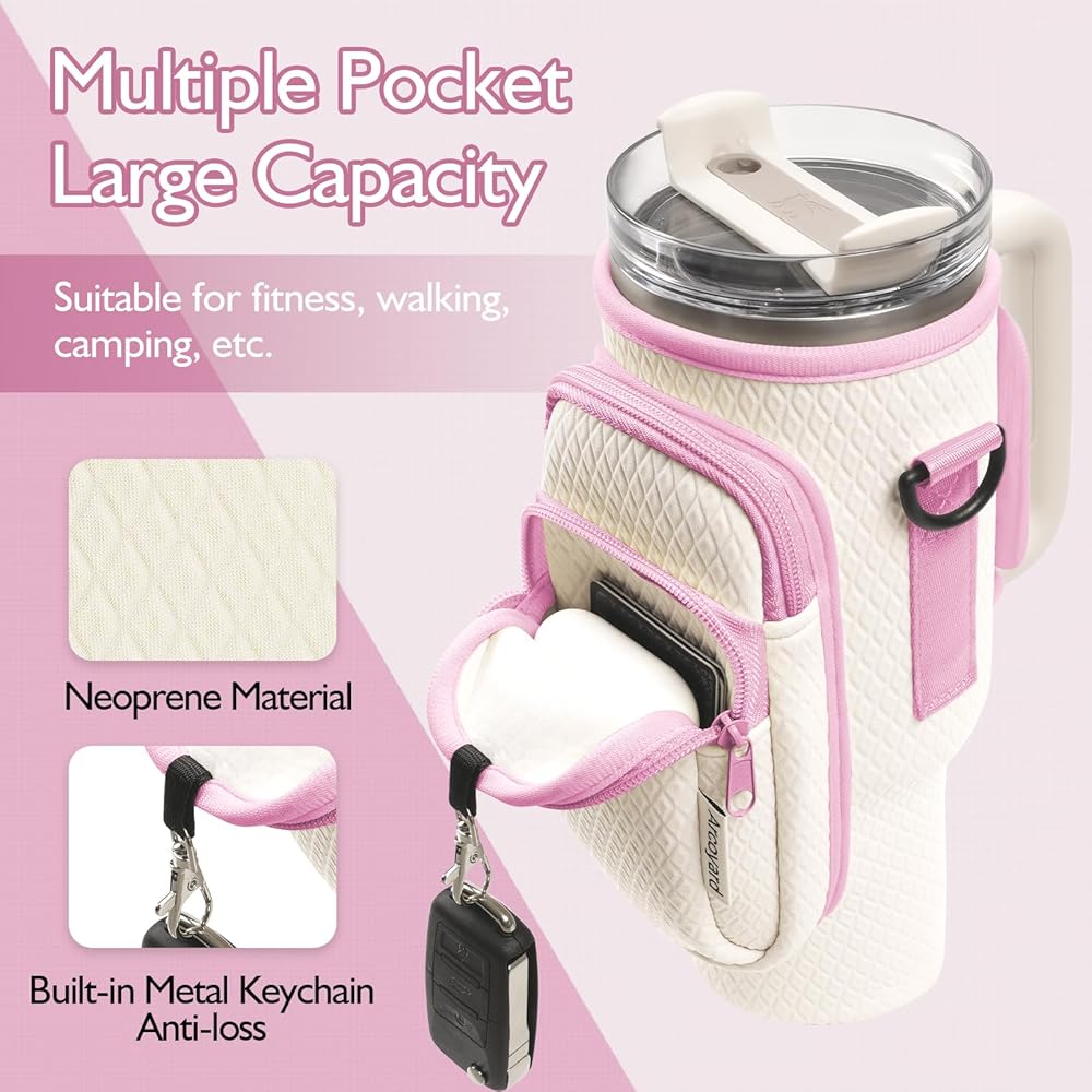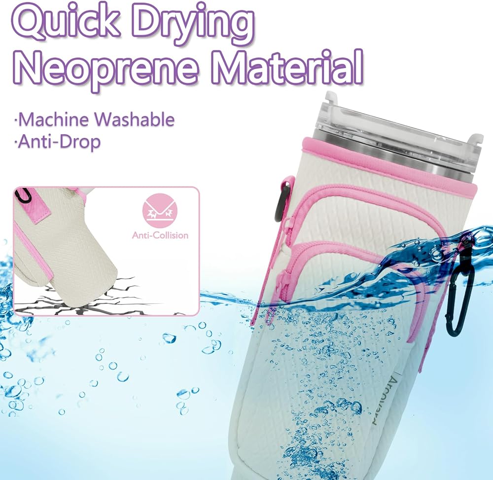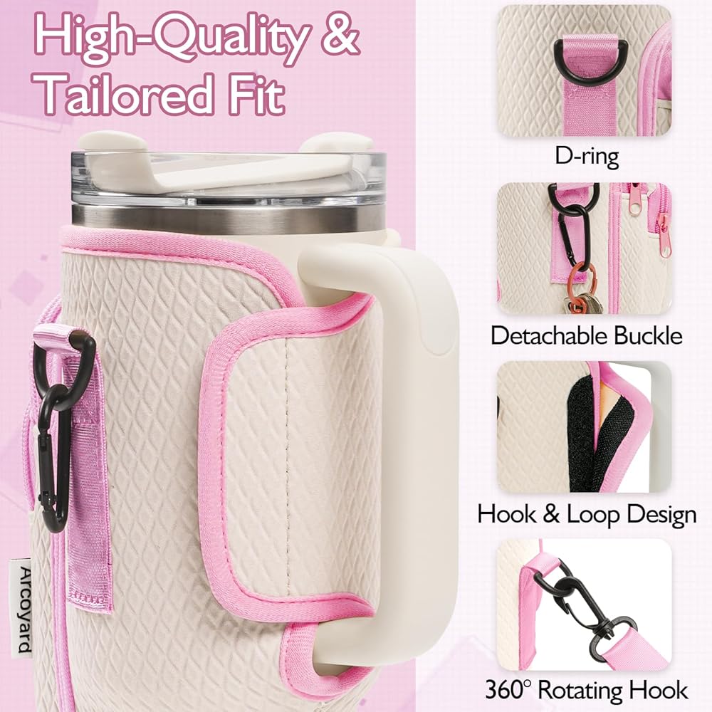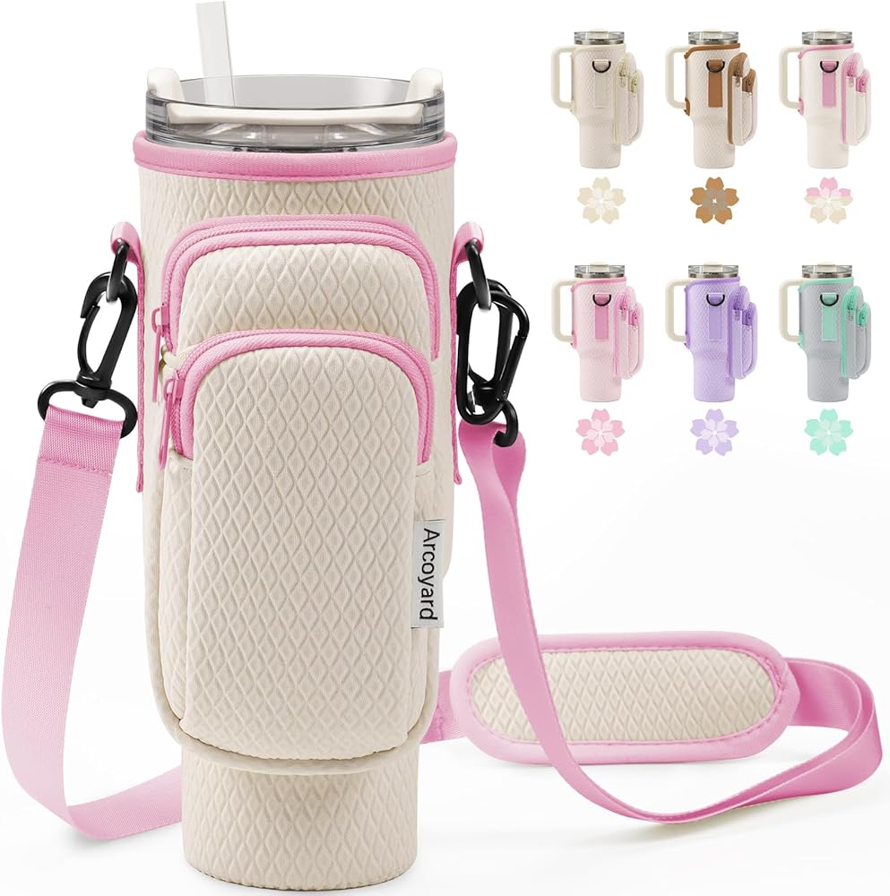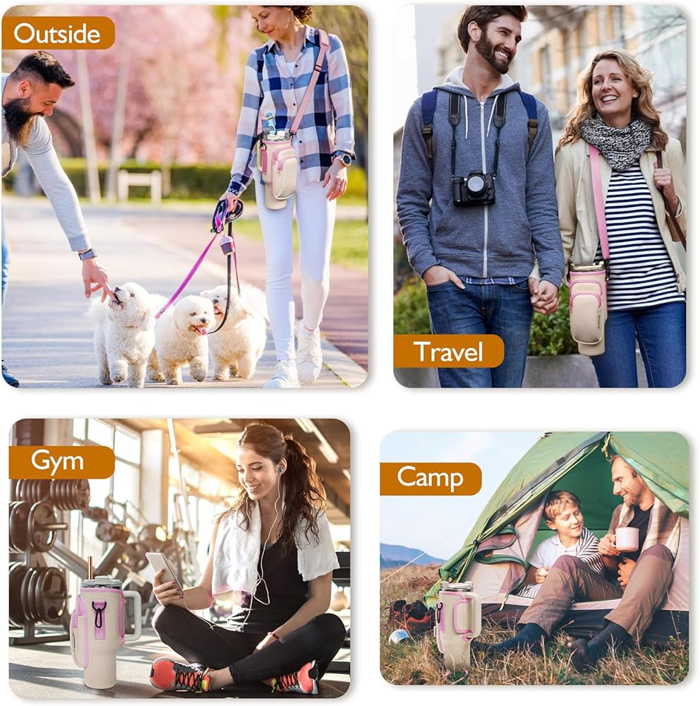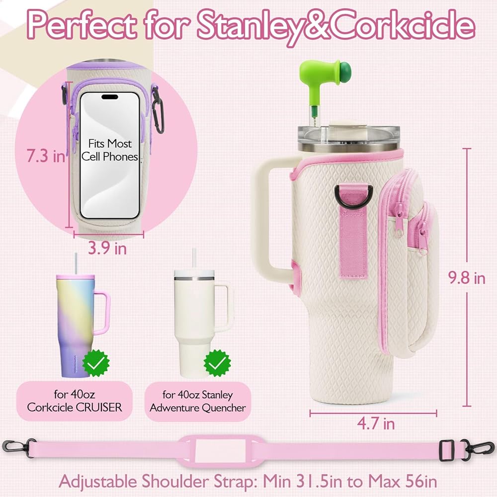 حامل زجاجة مياه مع حزام قابل للتعديل لكوب ستانلي سعة 40 أونصة بمقبض، وحقيبة ستانلي مع جيوب للهاتف والمفاتيح، تأتي مع فرشاة من القش، وإكسسوارات كأس ستانلي