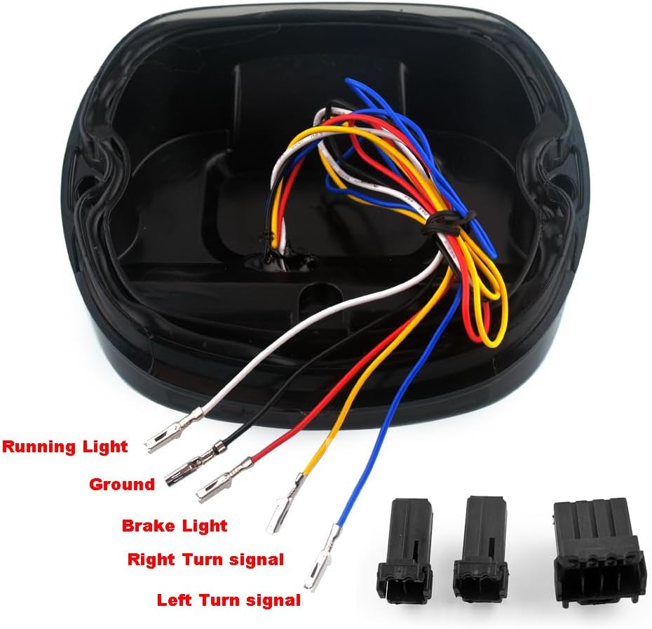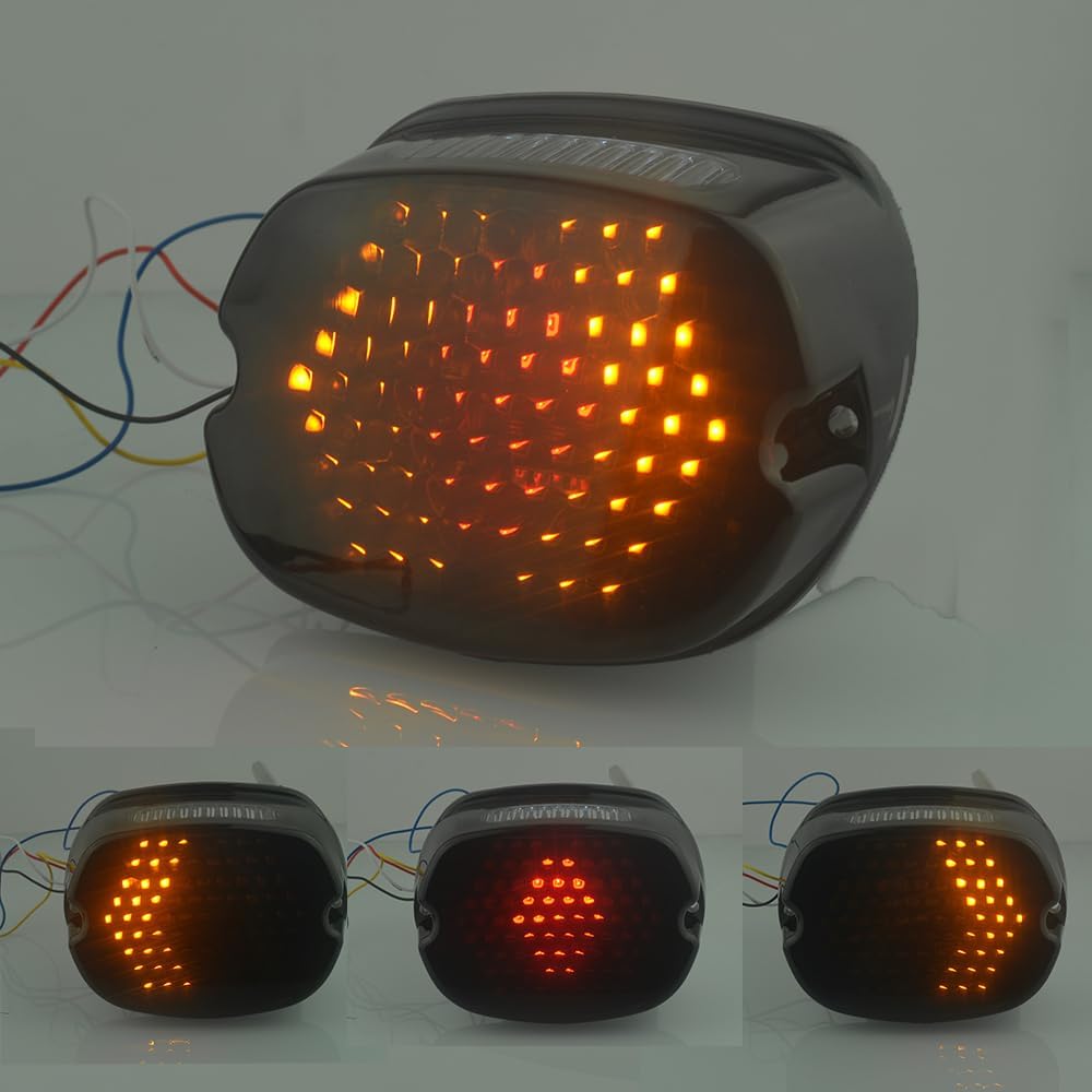 Tail light with running/ brake/ integrated turn signal lights, brighter than stock tail light come with streamlined, low-profile shape with a smoked lens, upgrade the turn signal plug, directly plug and play, easy Install. Lay Down Style, which is angled to follow the curve of your rear fender for the streamline look,the built-in SMD LED lights operate at 12V, 9W producing bright and reliable illumination.