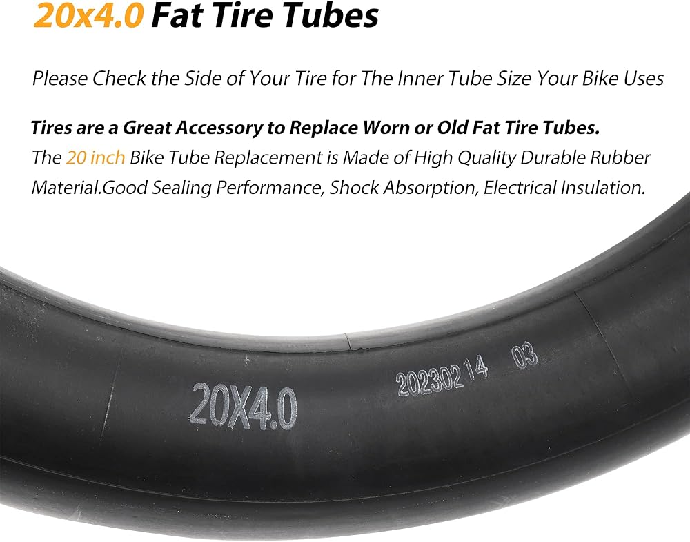 【تعليمات التثبيت】إنها أنابيب إطارات سميكة مقاس 20 × 4.0. يرجى التحقق من جانب إطارك لمعرفة حجم الأنبوب الداخلي الذي تستخدمه دراجتك