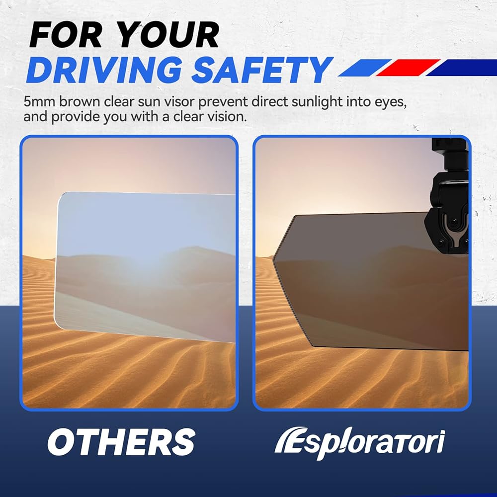【مضاد للوهج】يمكن لواقي الشمس UTV باللون البني الملون أن يحجب أشعة الشمس المبهرة بشكل فعال ويوفر رؤية أكثر وضوحًا لقيادتك. مع مظلة الشمس هذه، يمكنك القيادة بشكل مريح، دون القلق بشأن تعب العين أو عدم الراحة.