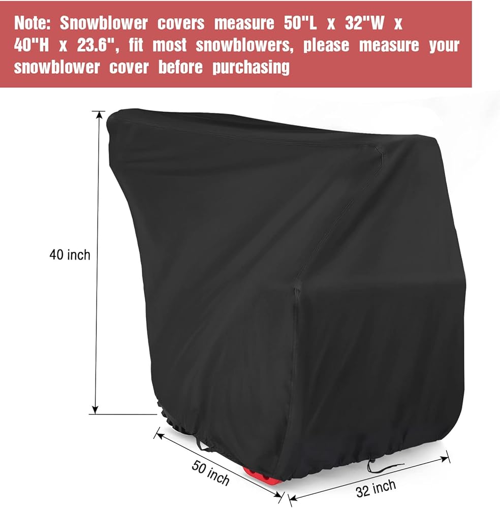 💨Universal Size: Snowblower cover is 50"X32"X40"(LxWxH), Snowblower cover is suitable for Ariens, Cub Cadet, Honda, Husqvarna, Simplicity, Snow Joe, Toro, Ryobi, Greenworks, Power Smart, Crafstman,Ariens , Cub Cadet, Dirty Hand Tools snow blowers and other two-stage snow blowers.