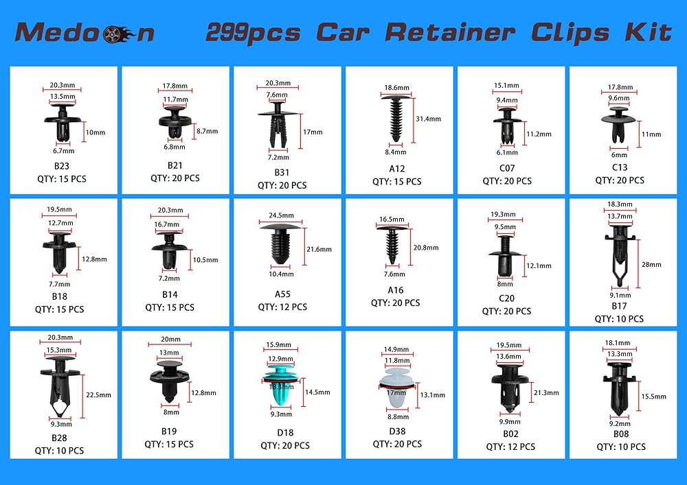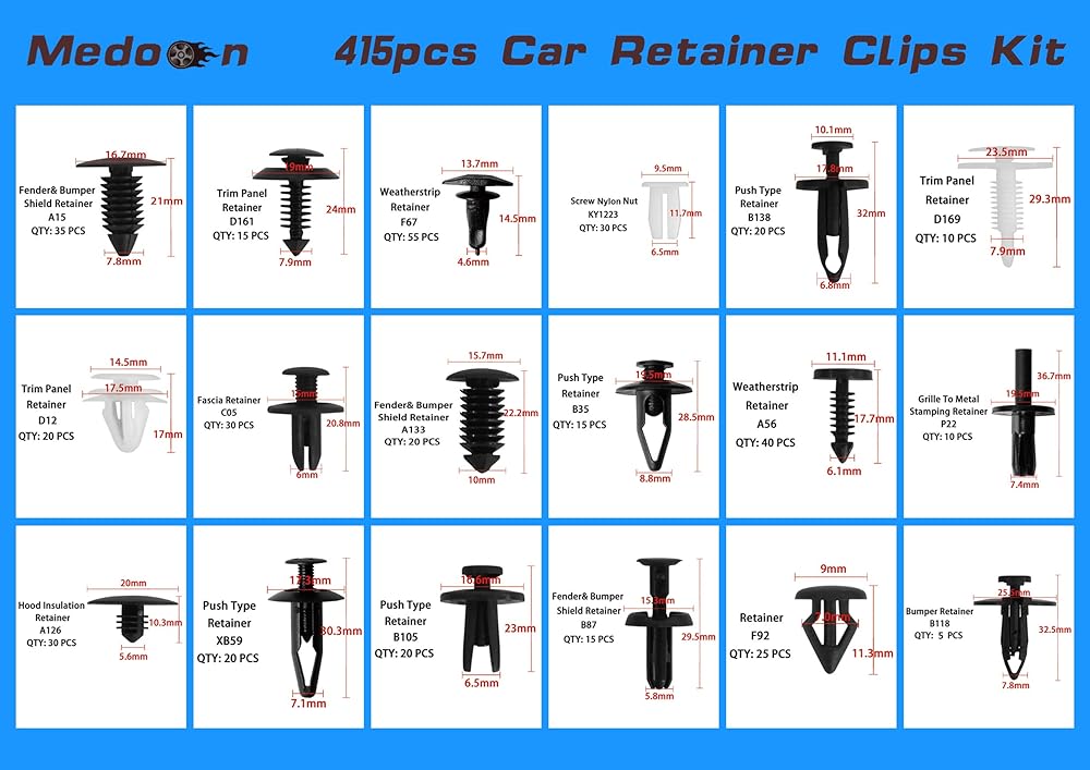 مفيدة على نطاق واسع: تُستخدم مشابك الدفع التلقائي على نطاق واسع للوحة الباب، ومشابك تزيين الأبواب، ومشابك الصدمات، والإكسسوارات الداخلية واستبدال مثبتات درع الرش. جميع المثبتات الضرورية للاستبدال الدقيق للمثبت القديم والمكسور.