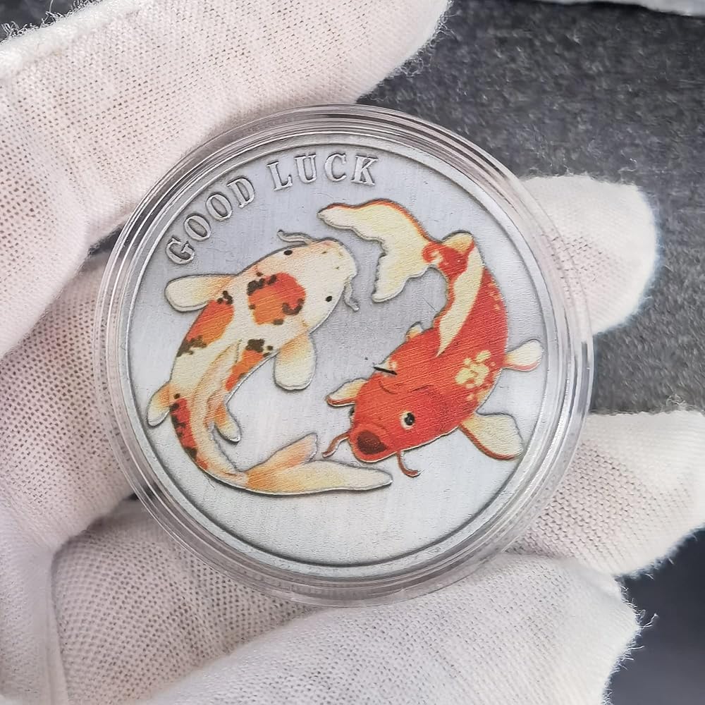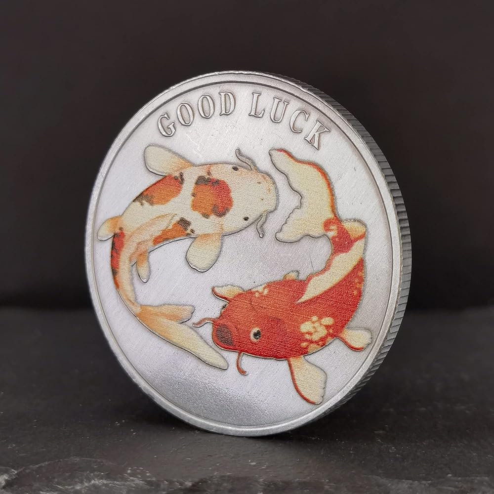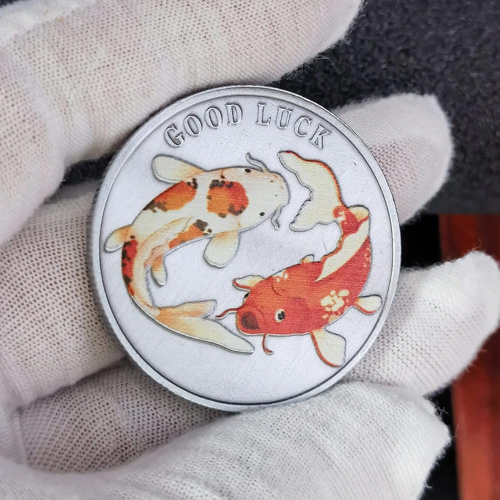 ➤Exquisite Design: This captivating antique silver metal lucky coin, measuring 1.57 inches in diameter, features an intricately embossed and color-printed design on the front. A pair of graceful koi fish, symbolizing good luck, accompanied by the words "GOOD LUCK" to enhance positive energies.