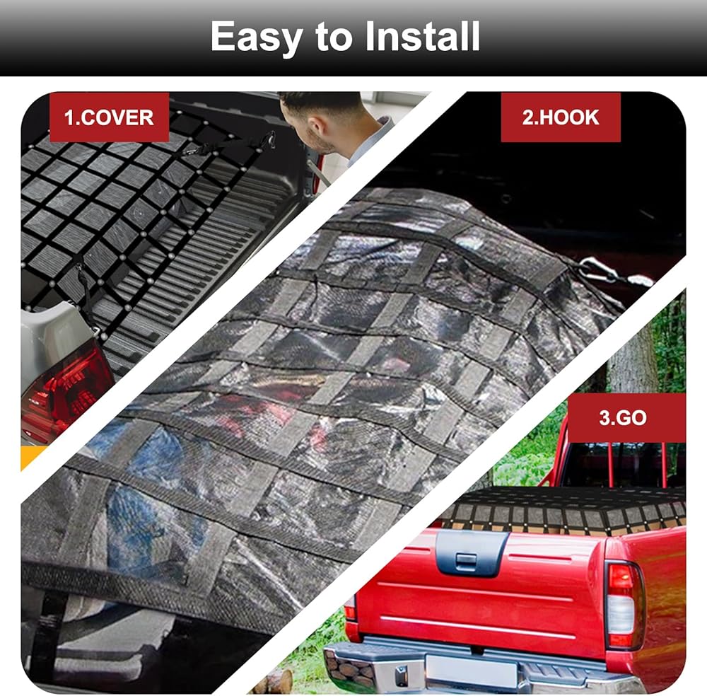 شبكة شحن شديدة التحمل من EASYBERG لسرير شاحنة الالتقاط، شبكة شحن كبيرة جدًا مقاس 10 × 12 قدم مع شبكة وإبزيم كام وخطافات على شكل حرف S وحزام متقاطع، شبكة شحن بسعة 1500 رطل لسيارات الجيب ذات الدفع الرباعي