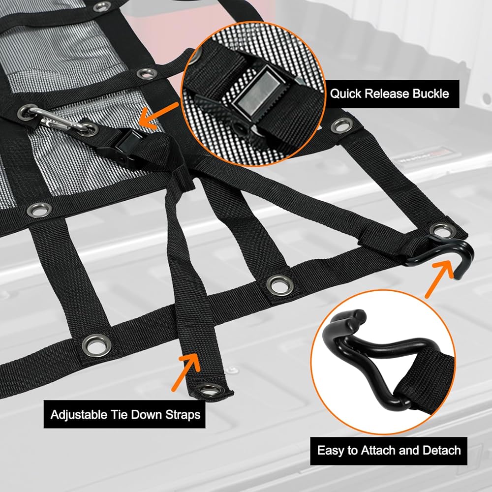 تتميز شبكة الشحن شديدة التحمل هذه بحزام وشبكة مدمجة لا تمنع حدوث عقبات وأضرار لحمولتك فحسب، بل توفر أيضًا أمانًا إضافيًا للأشياء الصغيرة، مما يجعلها مثالية لنقل مجموعة واسعة من البضائع.