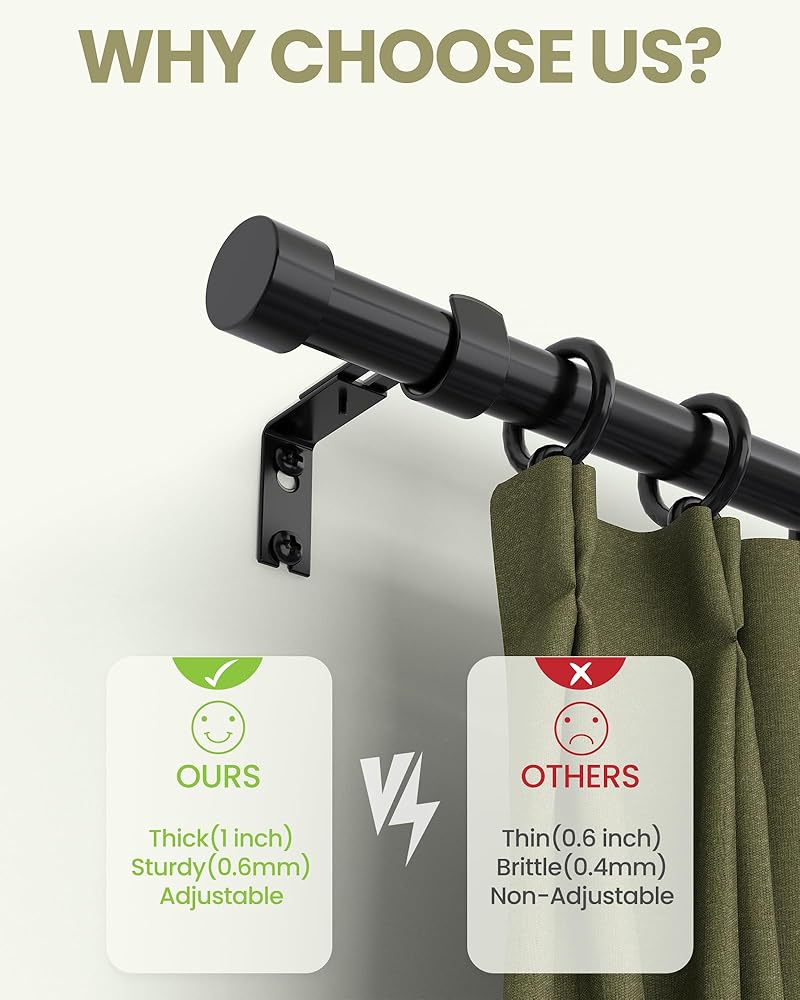 قوية ومتينة: بقطر 1 بوصة وسمك 0.6 مم، قضبان الستائر مصنوعة من معدن قوي. لا يوجد ترهل في المنتصف، يمكن لقضيب الستارة الأسود أن يحمل ستائر التعتيم الثقيلة بشكل جيد.
