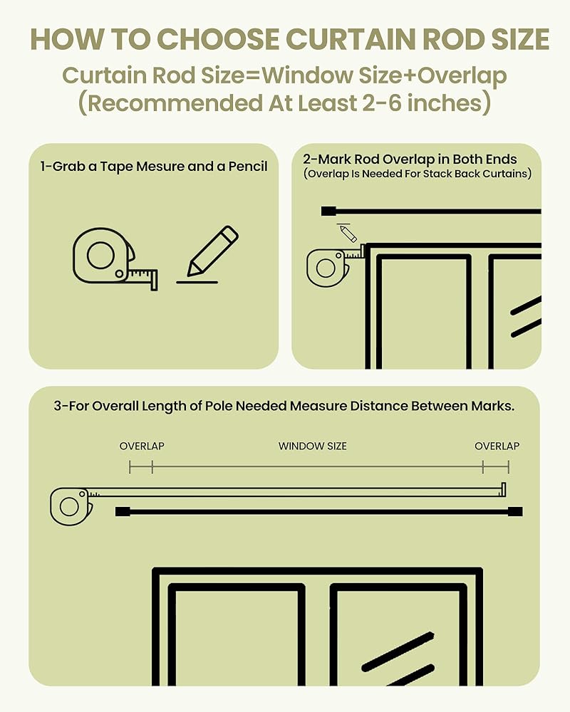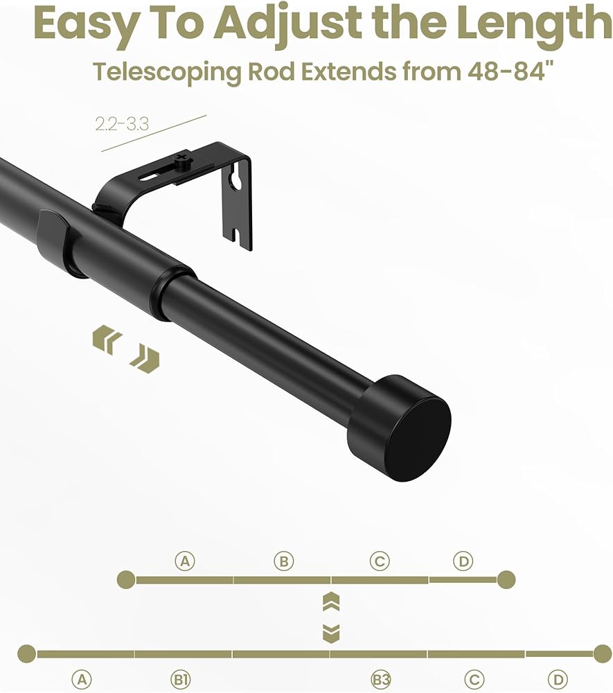 طول قابل للتعديل: قضبان الستارة سهلة التعديل في الطول، من 18 إلى 84 بوصة (1.5-7 قدم)، ويمكن أن تعمل مع مجموعة واسعة من أحجام النوافذ. تناسب غرفة المعيشة وغرفة النوم والمطبخ والحمام والدراسة والشرفة والفناء والعريشة والمزيد.