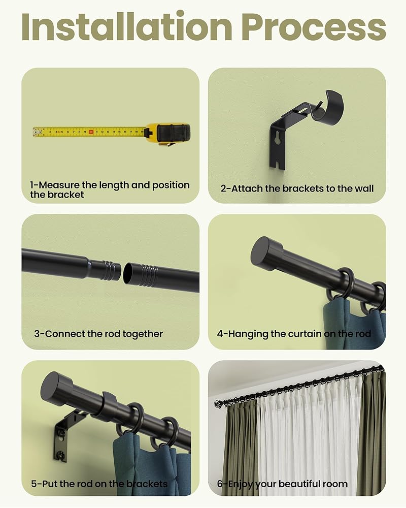 سهلة التركيب: من السهل تركيب قضيب ستارة النافذة معًا، فقط قم بربط عدد الأقسام التي تحتاجها. تأتي مع جميع الأجزاء والأجهزة اللازمة أثناء التثبيت.