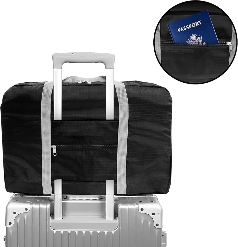 - The outer pocket can hold airline tickets, passports, etc. Thanks to the integrated luggage handle, the bag can be easily attached to standard suitcases of 18, 20, 24, 26, 28, 32 inches.