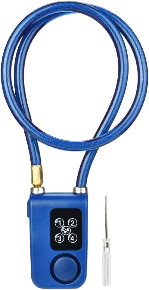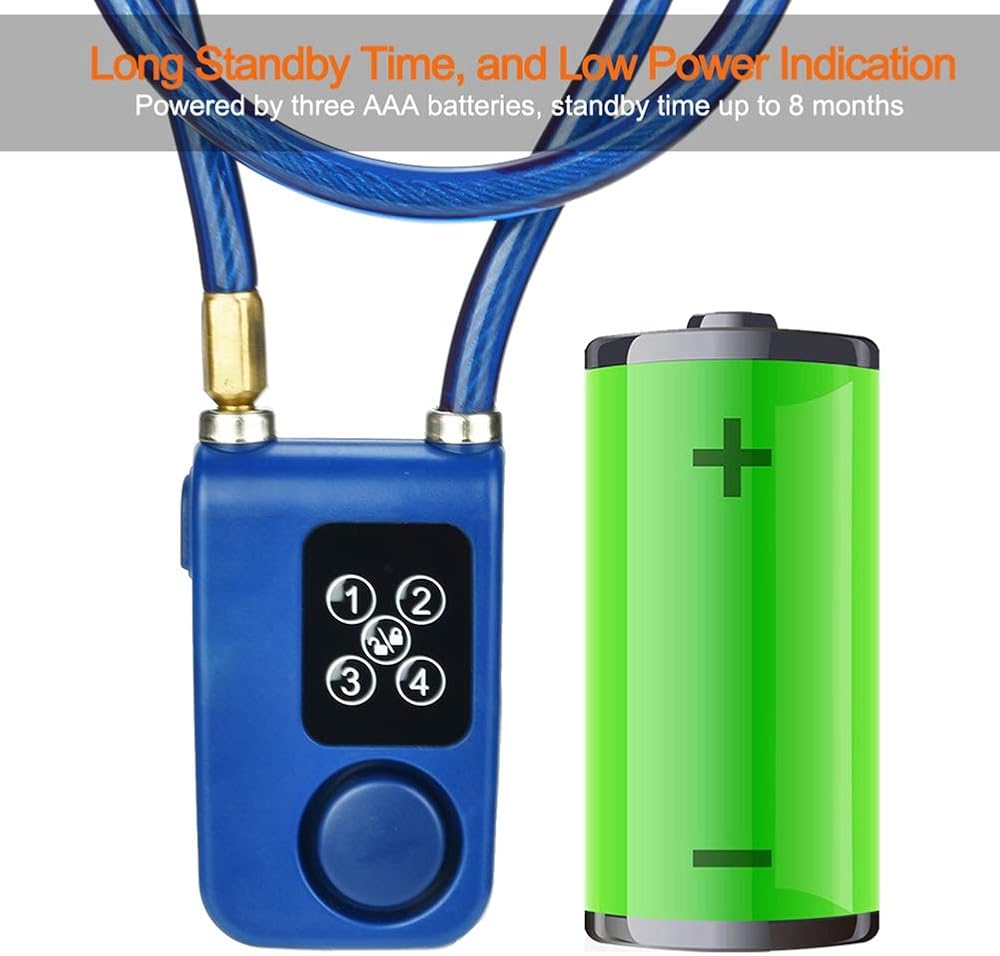 Alarm immediately when cutting steel rope or removing lock screw. Alarm immediately when shaking or moving the lock. Call the police immediately if you mistype your password three times. Drawing out the wire rope can be used as a defensive whip, wire rope diameter 10 mm, length 80 cm (optional 40 cm/1.2 m). Four-digit passwords with 256 password combinations. Lock/unlock button operation, no key required. Powered by three AAA No.7 batteries, 8 months standby time and have low power indication function. IP44 waterproof certification, suitable for indoor and outdoor use. It can be used normally at temperatures ranging from - 10 to + 60. Over 110 decibels of alarm sound.