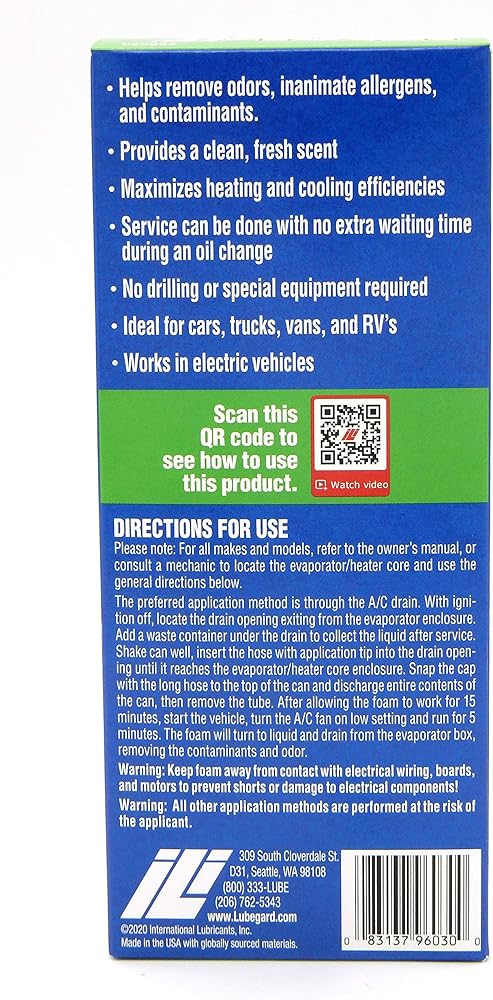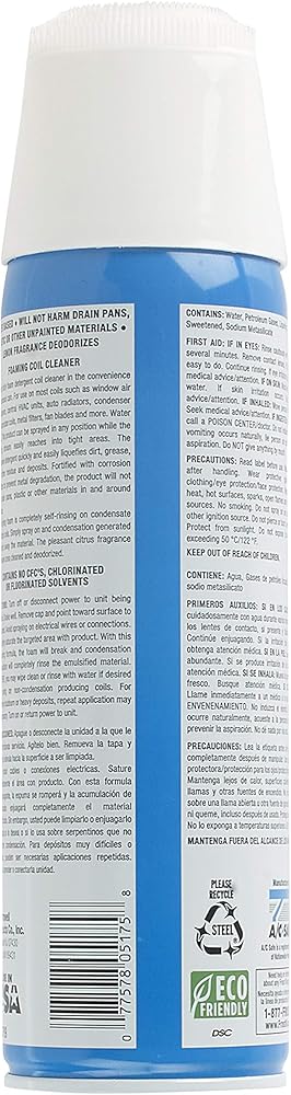 منظف لفائف المنظفات الرغوية الثقيلة في راحة علبة الهباء الجوي. للاستخدام على معظم الملفات مثل مكيفات هواء النوافذ، ووحدات التدفئة والتهوية وتكييف الهواء المركزية، ومشعات السيارات، وملفات المكثف والمبخر، والمرشحات المعدنية، وشفرات المروحة والمزيد. ذو أساس مائي. يمكن رش هذا المنتج في أي موضع بينما يصل تيار التفجير بسهولة إلى المناطق الضيقة. يعمل المنظف القوي على تسييل الأوساخ والشحوم والزيوت أو غيرها من المخلفات والرواسب بسرعة وسهولة. معزز بمثبطات التآكل لمنع تدهور المعدن، ولن يضر بأحواض الصرف أو البلاستيك أو المواد الأخرى داخل المنطقة وحولها. يتم شطف رغوة التشبث ذاتيًا تمامًا على ملفات إنتاج المكثفات. ما عليك سوى الرش وسيقوم التكثيف المتولد بغسل المادة. تساعد رائحة الحمضيات اللطيفة على ترك رائحة المنطقة نظيفة ومزيلة للروائح الكريهة. لا يحتوي على مركبات الكربون الكلورية فلورية أو المذيبات المكلورة أو المفلورة. تنظيف الملفات يزيد من الكفاءة ويوفر المال. الاتجاهات: قم بإيقاف تشغيل أو فصل الطاقة عن الوحدة التي تتم صيانتها. هز جيدا. قم بإزالة الغطاء وأشر نحو السطح المراد تنظيفه. تجنب الرش على الأسلاك أو التوصيلات الكهربائية. قم بتشبع المنطقة المستهدفة تمامًا بالمنتج. مع هذه التركيبة ذاتية الشطف، سوف تنكسر الرغوة وسيؤدي تراكم التكثيف إلى شطف المادة المستحلبة بالكامل. يعد غطاء الفرك رائعًا لإزالة قطع الحطام الكبيرة والمضمنة. يمكنك مسحها أو شطفها بالماء إذا رغبت في ذلك أو في حالة استخدامها على ملفات غير متكثفة. بالنسبة للرواسب العنيدة أو الثقيلة للغاية، قد يكون من الضروري تكرار التطبيق. قم بتشغيل أو إعادة الطاقة إلى الوحدة.