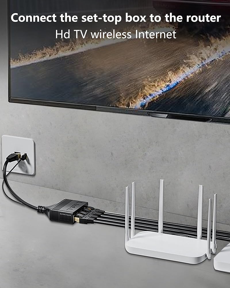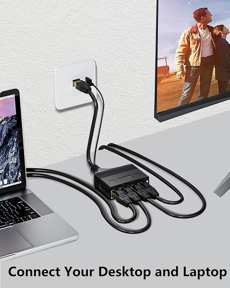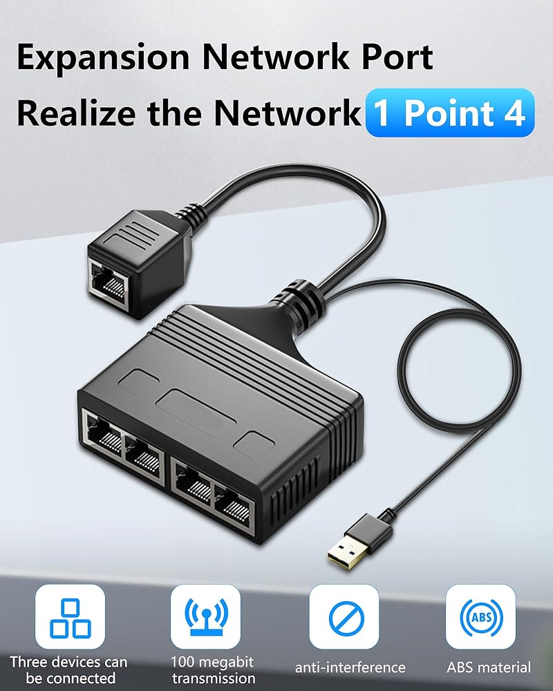 • Ethernet Splitter 1 to 4 High Speed: Ethernet Port Splitter is mainly used to solve the connection problem caused by insufficient wiring, use the USB power supply cable and support three computers to share one ethernet cable simultaneously by means of the physical tapping method. Note: Four Female Port Workable Simultaneously.