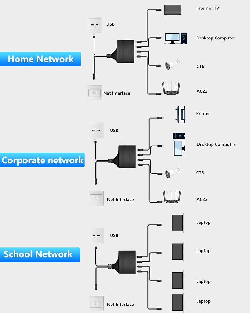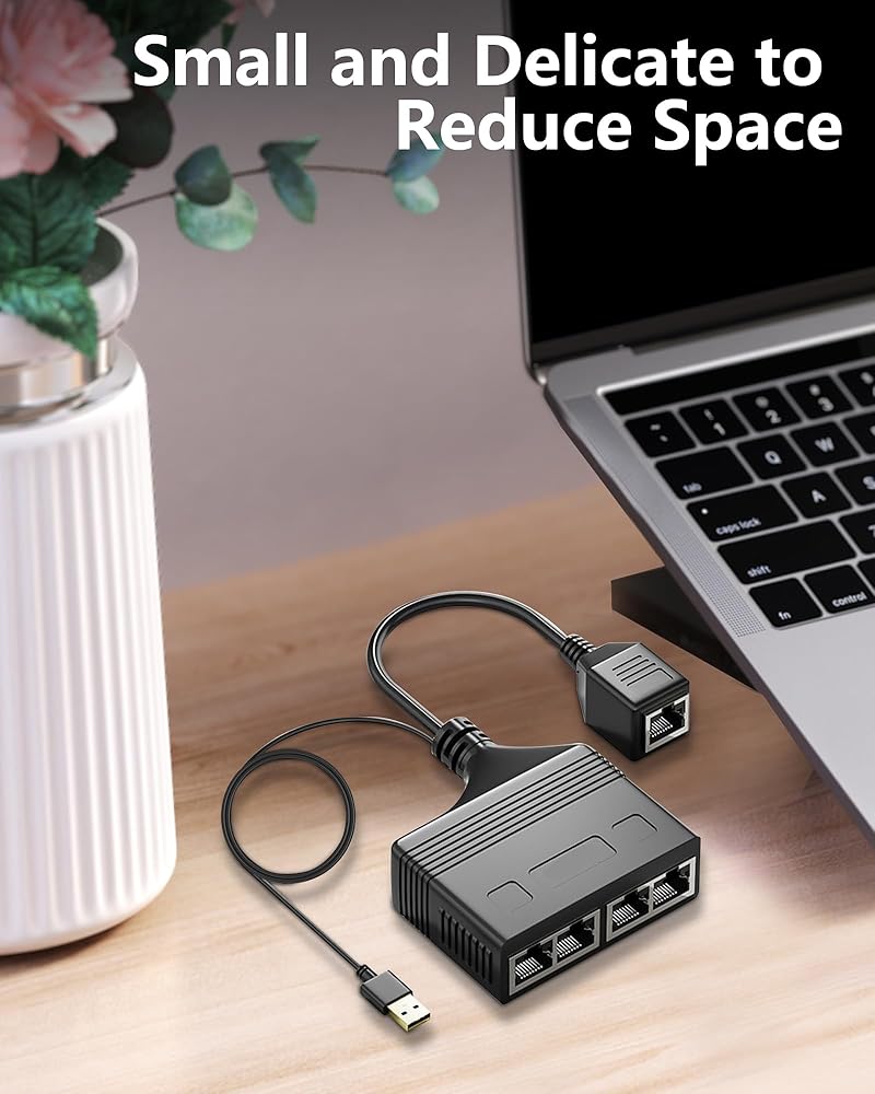 • Important Note: This Gigabit RJ45 Ethernet Splitter equipped with a 1M/3.2 ft USB charging cable, it can support charging(recommended power socket as it is more stable). Can not be used without power connection.