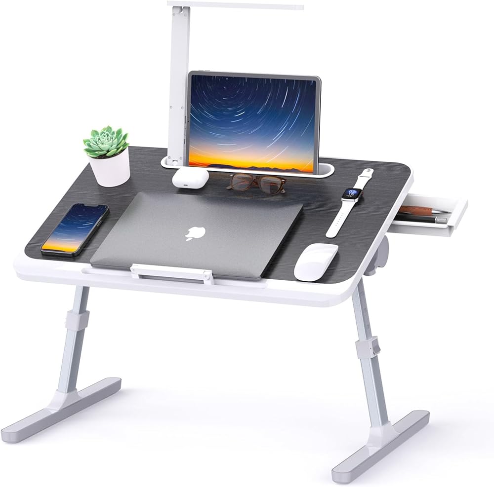 مكتب لاب توب مع ضوء LED ودرج، طاولة سرير محمولة للأريكة والدراسة والقراءة، مكتب لاب توب قابل للتعديل للكمبيوتر المحمول والكتابة (أسود)