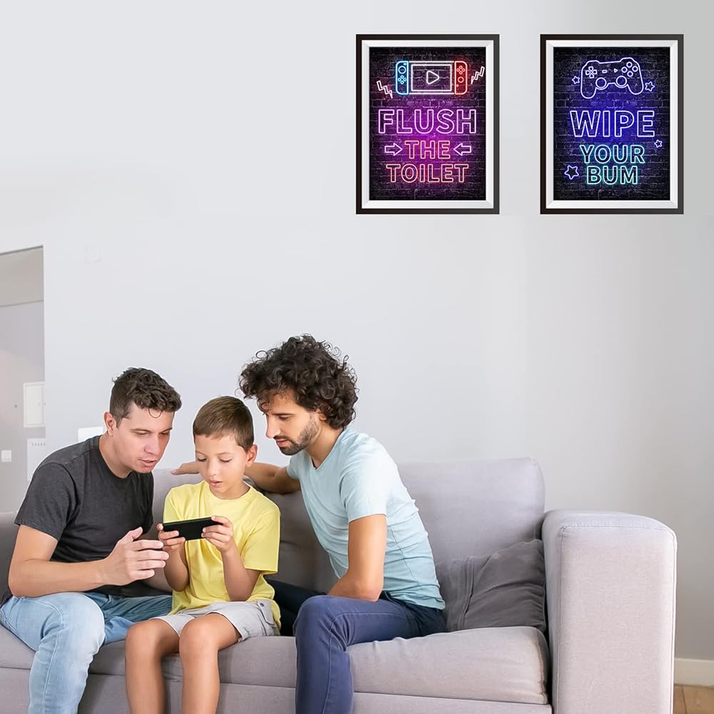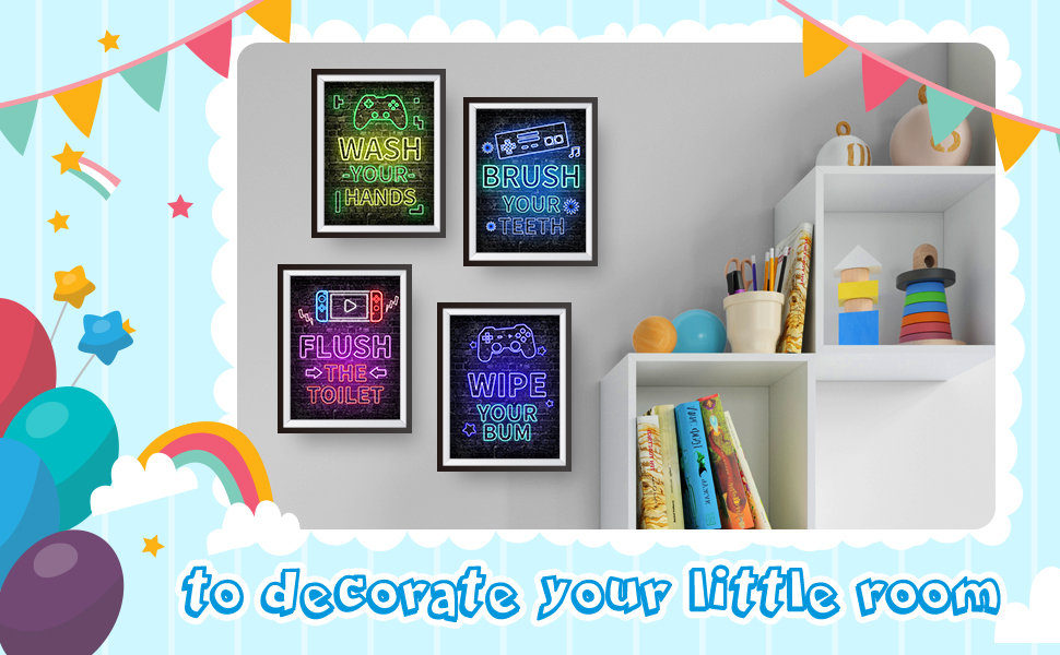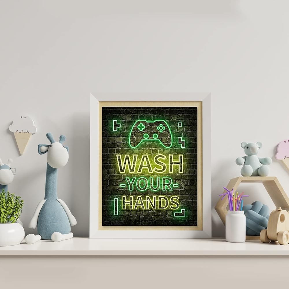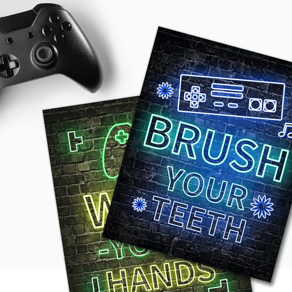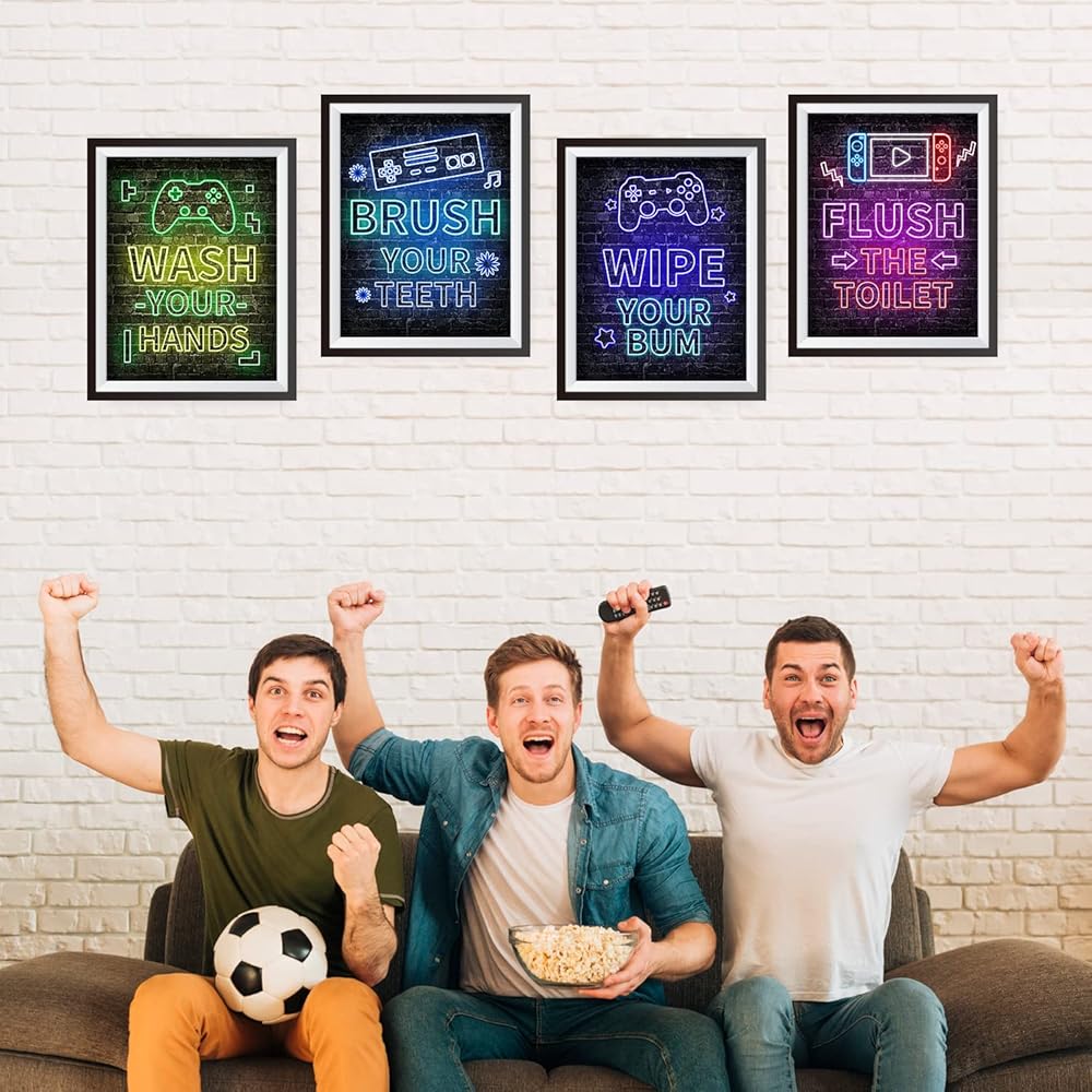 مجموعة ديكور ألعاب فيديو نيون مكونة من 4 قطع (8 × 10 بوصة)، ديكورات غرفة الأولاد للحمام، كلمات مضحكة، لوحة فنية جدارية لألعاب الأطفال الصبيان، ديكور جداري للاعبين، حمام صبي في سن المراهقة، بدون إطارات (4 عبوات)