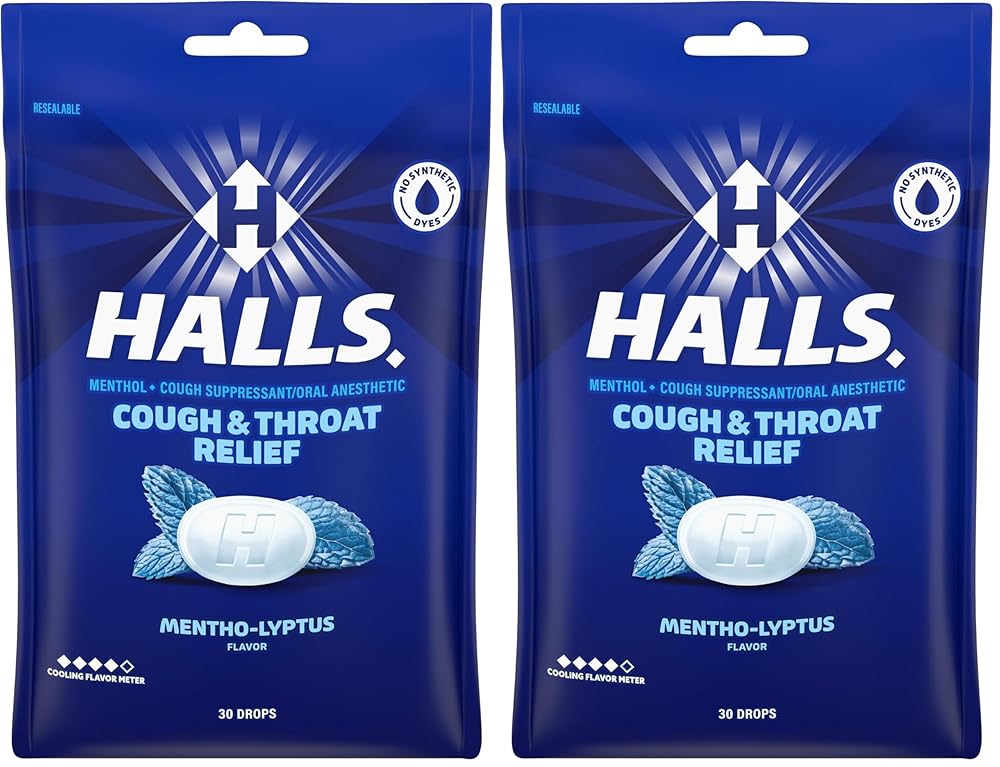 Halls Menthlyptus Dr Size 30ct Halls Menthylyptus Drops 30ct - HALLS Relief Mentho-Lyptus Cough Drops are ready for whatever life throws, or coughs, your way. With 5.4 mg of menthol per drop, these eucalyptus cough drops relieve coughs, soothe sore throats, and cools nasal passages to quickly relieve your worst symptoms. Whether you're using these cough suppressant drops for sore throat relief, cough relief, or as an oral anesthetic, dissolve one drop in your mouth slowly and repeat every two hours as needed. HALLS Relief cough drops are formulated for adults and children five years and older. These sore throat drops are individually wrapped and come in a resealable bag for portability and freshness, making them perfect for a healthy gift or care package. This bag holds 30 drops. Directions: Adults and children 5 years and over: dissolve 1 drop slowly in the mouth. Repeat every 2 hours as needed. For children under 5 years: ask a doctor. WARNINGS. SORE THROAT WARNING: If sore throat is severe, persists for more than 2 days, is accompanied or followed by fever, headache, rash, swelling, vomiting, or nausea, consult a doctor promptly. These may be serious. ASK A DOCTOR TO USE IF YOU HAVE: Persistent or chronic cough such as occurs with smoking, asthma, or emphysema. ? cough accompanied by excessive phlegm (mucus). KEEP OUT OF REACH OF CHILDREN. CHOKING WARNING: Not for children under 4.