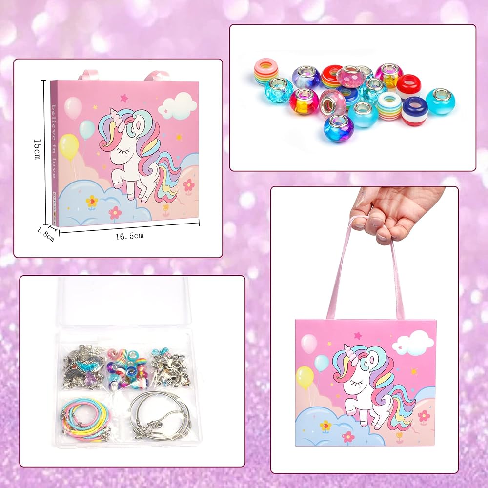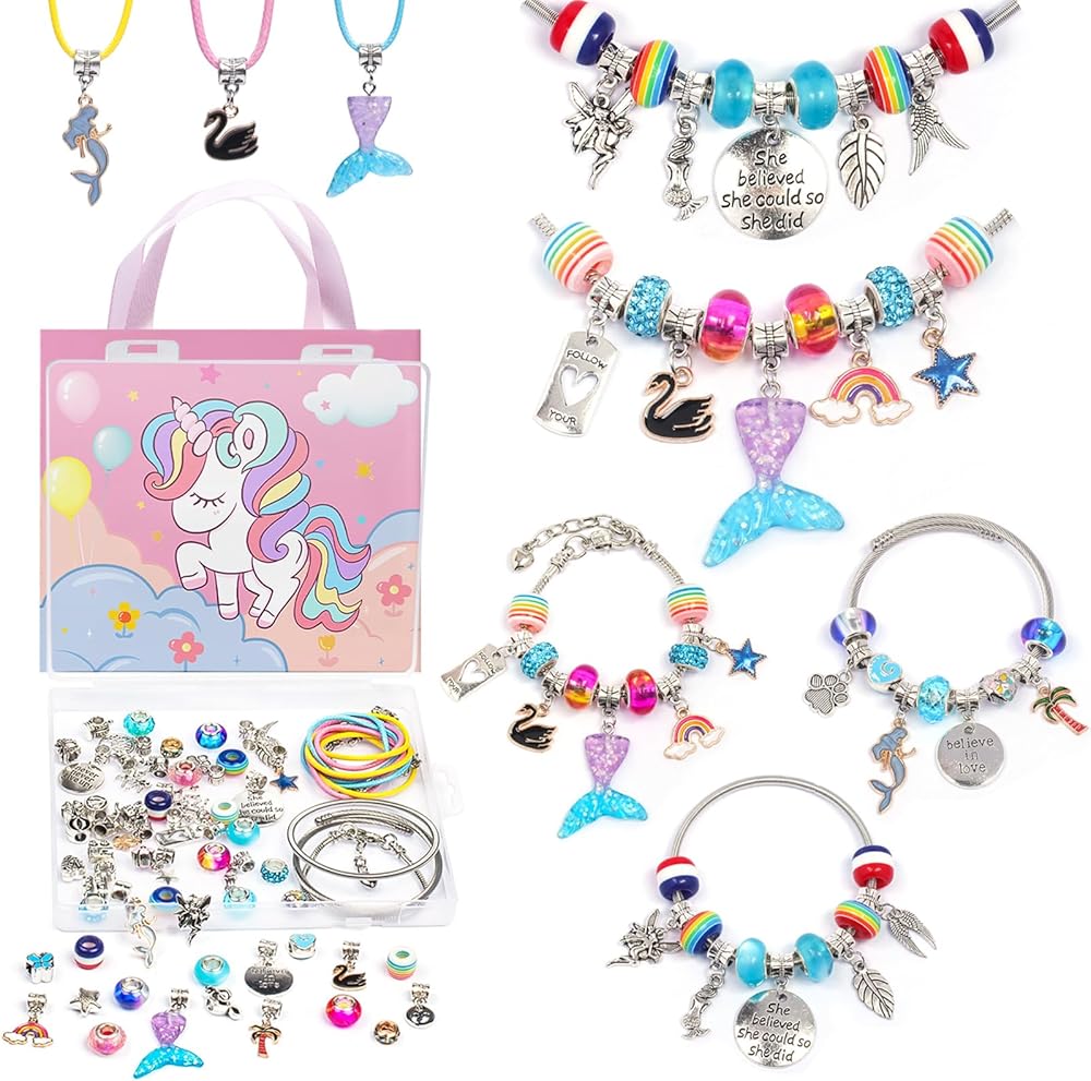 Different Surprise Craft Kit:This kids bracelet making kit includes a variety of charmingly themed charms and beads,mermaids,unicorns, angels,hearts,hawaii,summer,rainbows and more.You can wear different theme bracelets everyday.