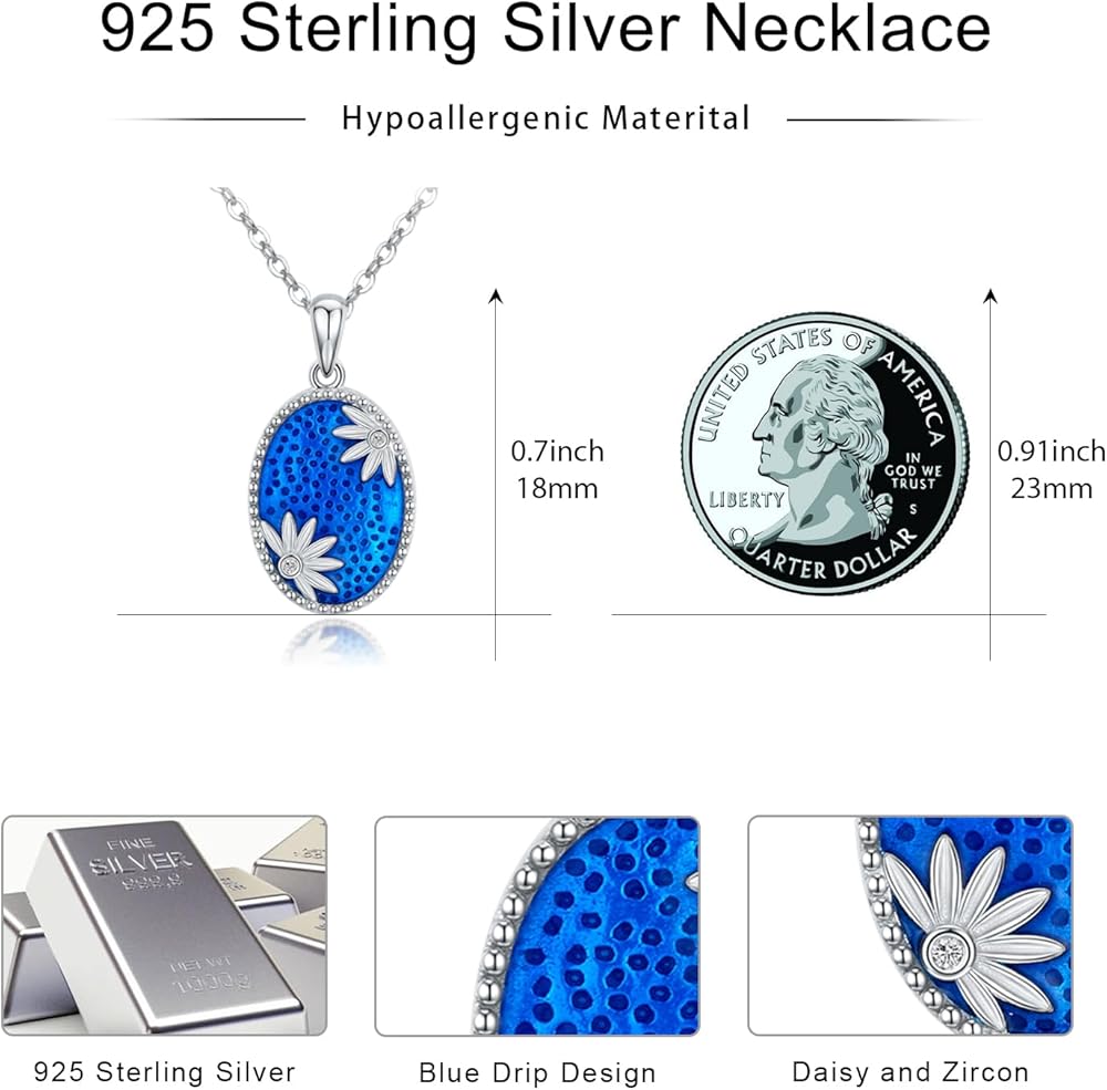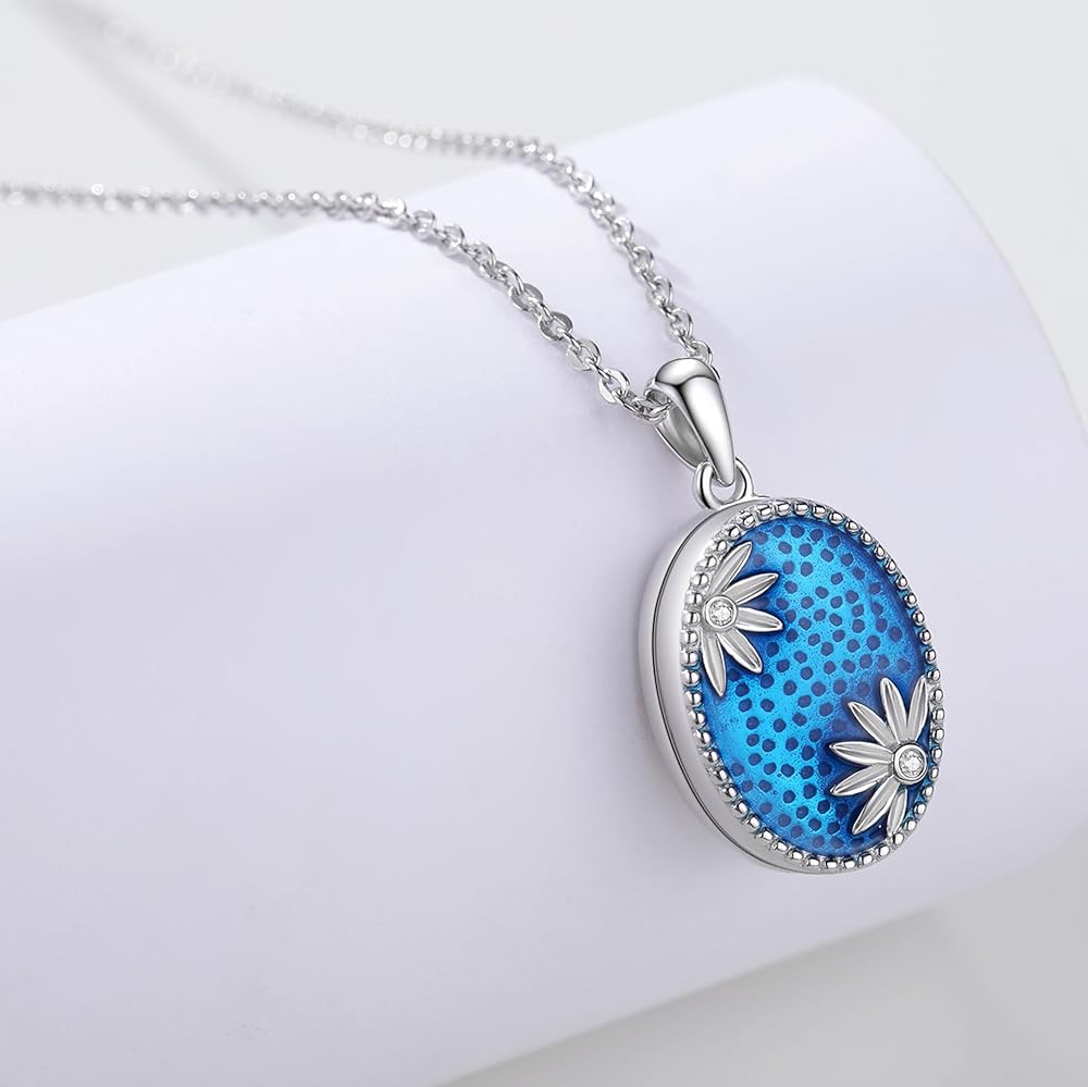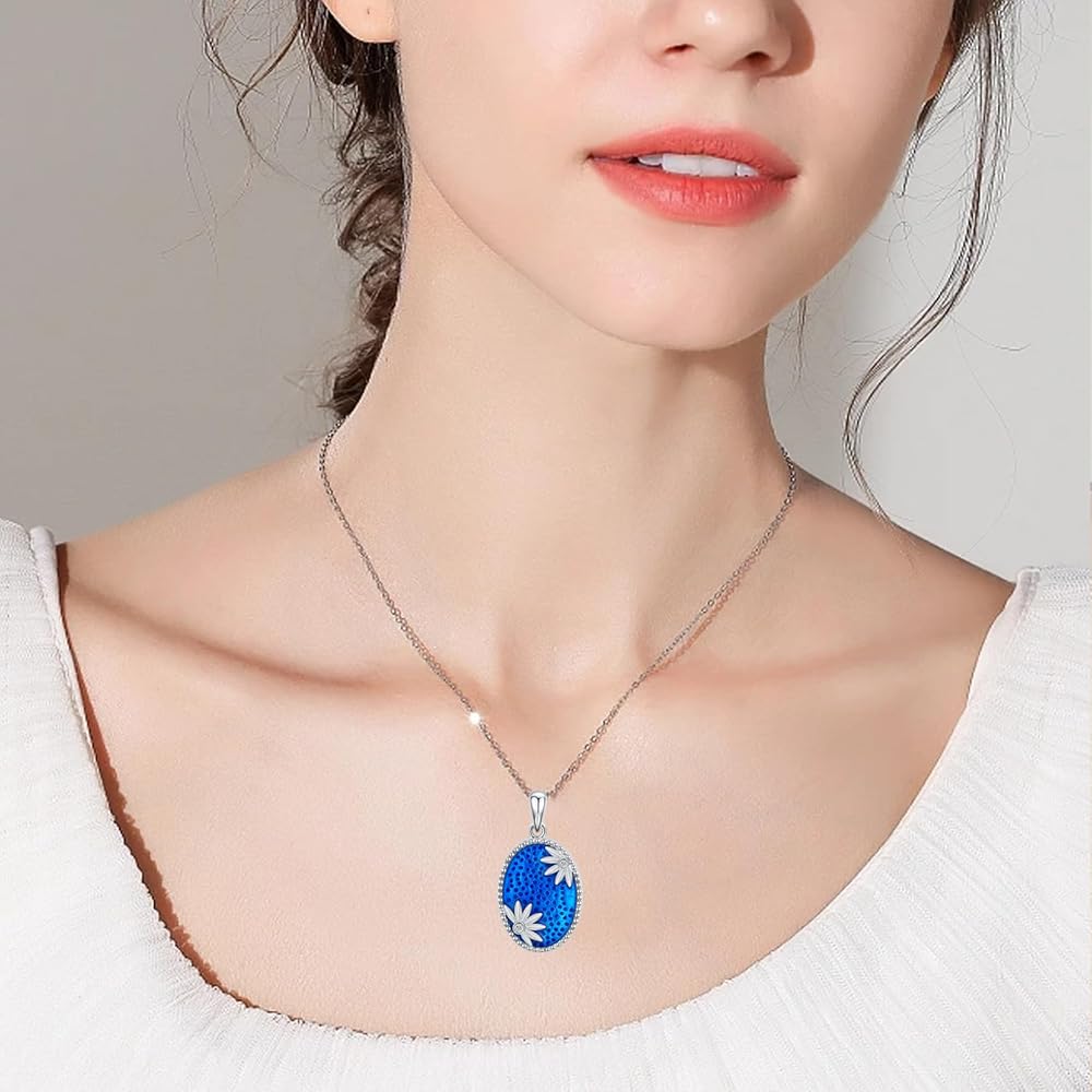 【Design Inspiration】: Daisies symbolize innocence, purity and beauty. They also represent happiness, which comes from their warm appearance and many bright color variations. Use the blue oil drip daisy photo box necklace to store photos between you and your loved one, bringing you close to each other's hearts.