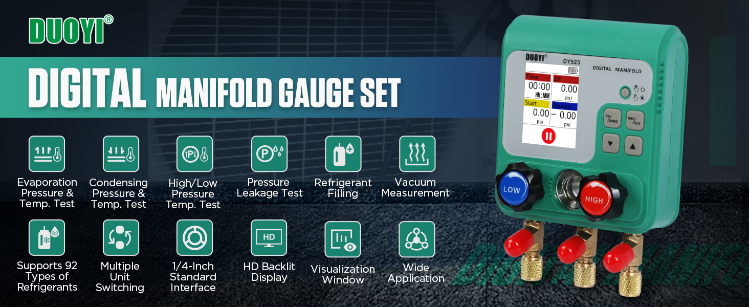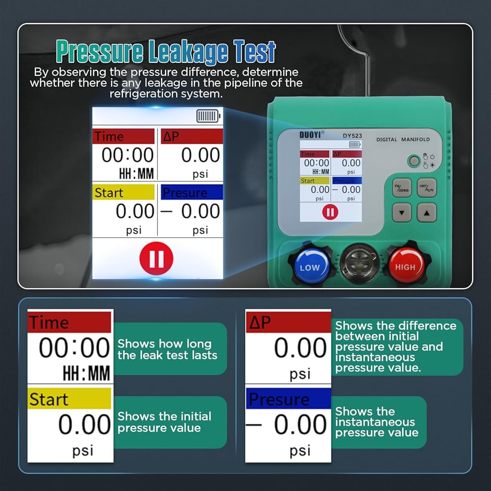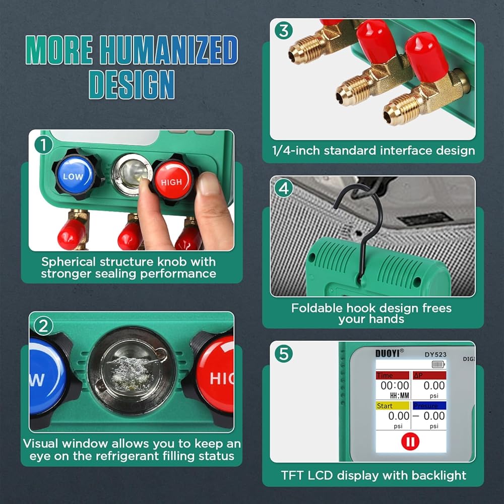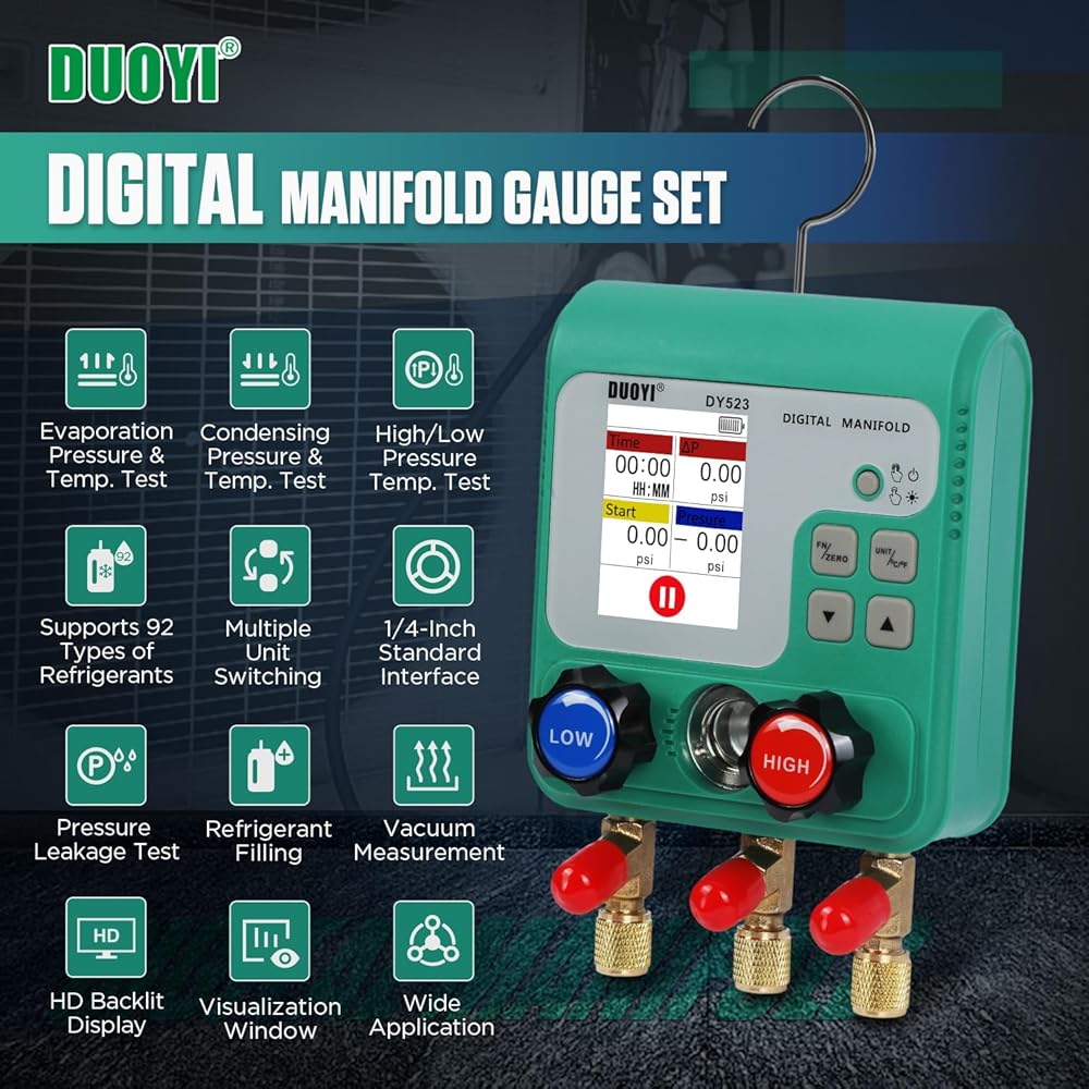 【مجموعة قياس مشعب رقمي ذكي متعدد الوظائف】مجموعة قياس مشعب التدفئة والتهوية وتكييف الهواء الرقمية لدينا متعددة الاستخدامات ولها ميزات مثل ملء المبرد، واختبار الضغط المزدوج، والمكنسة الكهربائية، واختبار ضيق الهواء، والتبديل متعدد الوحدات، ووظائف متعددة الأوضاع، ومدمجة. قاعدة بيانات المبردات، مناسبة لتركيب وصيانة مكيفات الهواء، والصيانة اليومية للثلاجات، والفحص اليومي لغرف التبريد وصيانة مكيفات الهواء في السيارات، وما إلى ذلك.