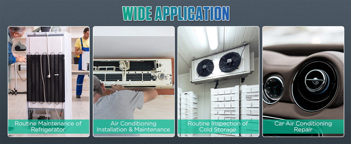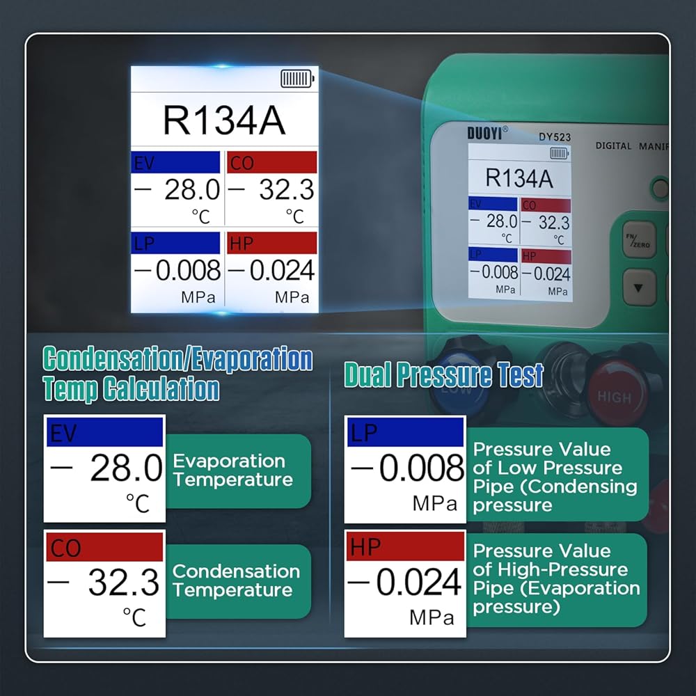 【اختبار الضغط المزدوج والتكثيف/عرض درجة حرارة التبخر】أثناء عملية ملء المبرد، ستقوم أجهزة القياس الرقمية hvac تلقائيًا بحساب قيمة ضغط المبرد في أنبوب الضغط المنخفض (ضغط التكثيف) وقيمة الضغط لأنبوب الضغط العالي ( ضغط التبخر). وفي الوقت نفسه، سيتم حساب وعرض درجة حرارة التكثيف/التبخر المقابلة لتوفير أساس موثوق للحكم على حالة تشغيل نظام التبريد.