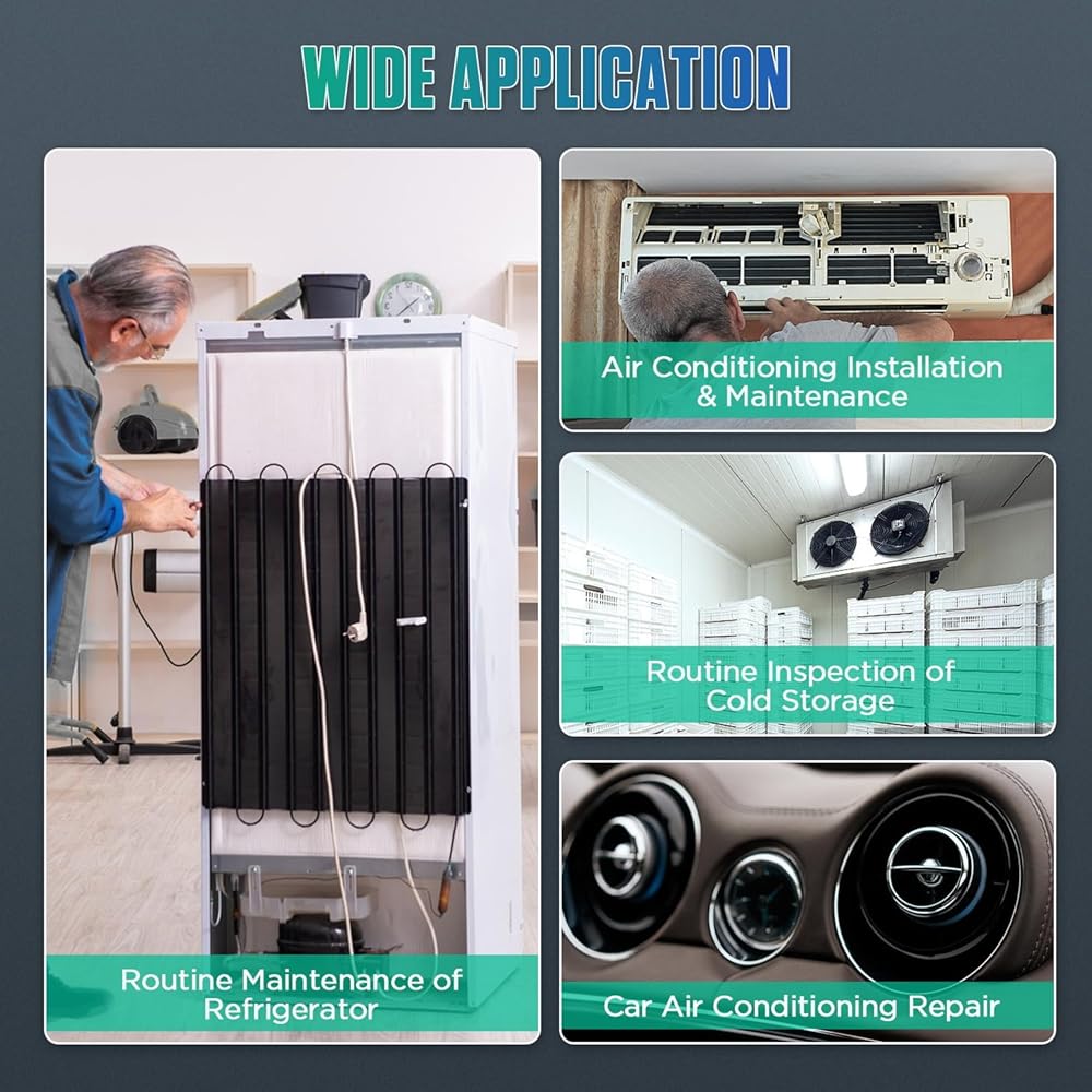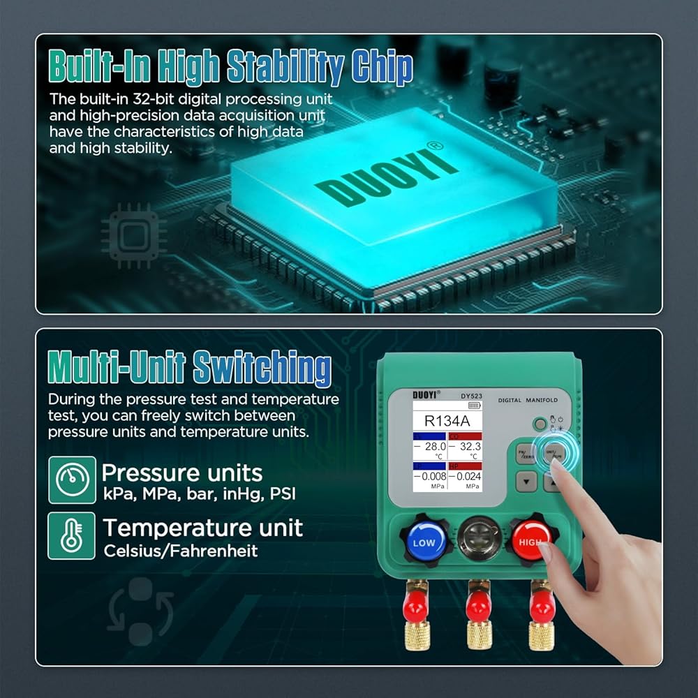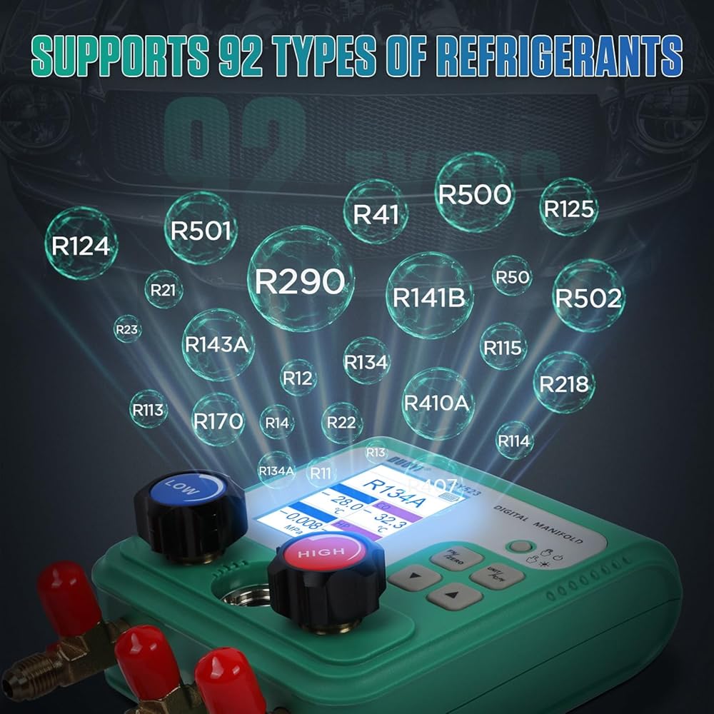 【مدمجة 92 نوعًا من بيانات المبردات ووحدة معالجة رقمية 32 بت】مقاييس رقمية للتدفئة والتهوية وتكييف الهواء مدمجة في 92 نوعًا من قاعدة بيانات درجة حرارة تبخر ضغط المبرد، ويمكنك تبديل أو ملء أنواع مختلفة من المبردات حسب الحاجة، وهي مناسبة لـ مجموعة متنوعة من مناسبات الصيانة. وحدة معالجة رقمية مدمجة 32 بت ووحدة الحصول على البيانات عالية الدقة، مع بيانات عالية وخصائص ثبات عالية، مما يجعل قياس بيانات الضغط أكثر استقرارًا ودقة.