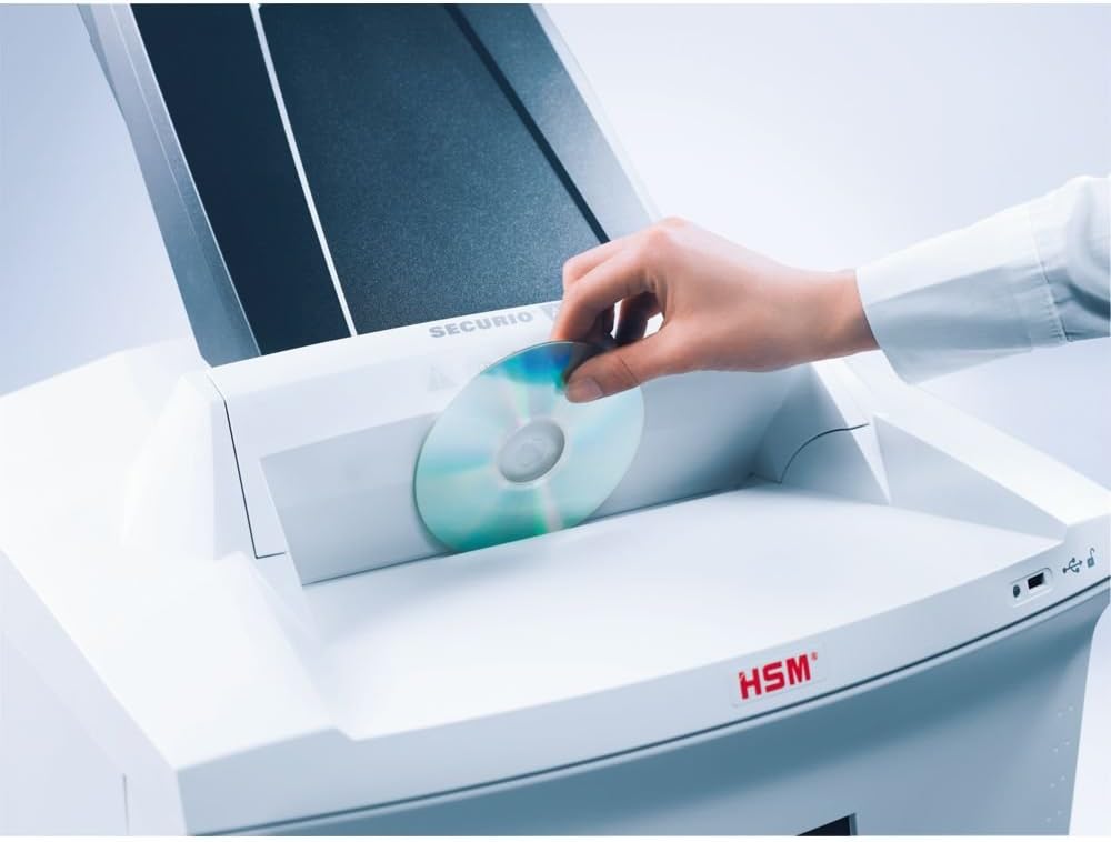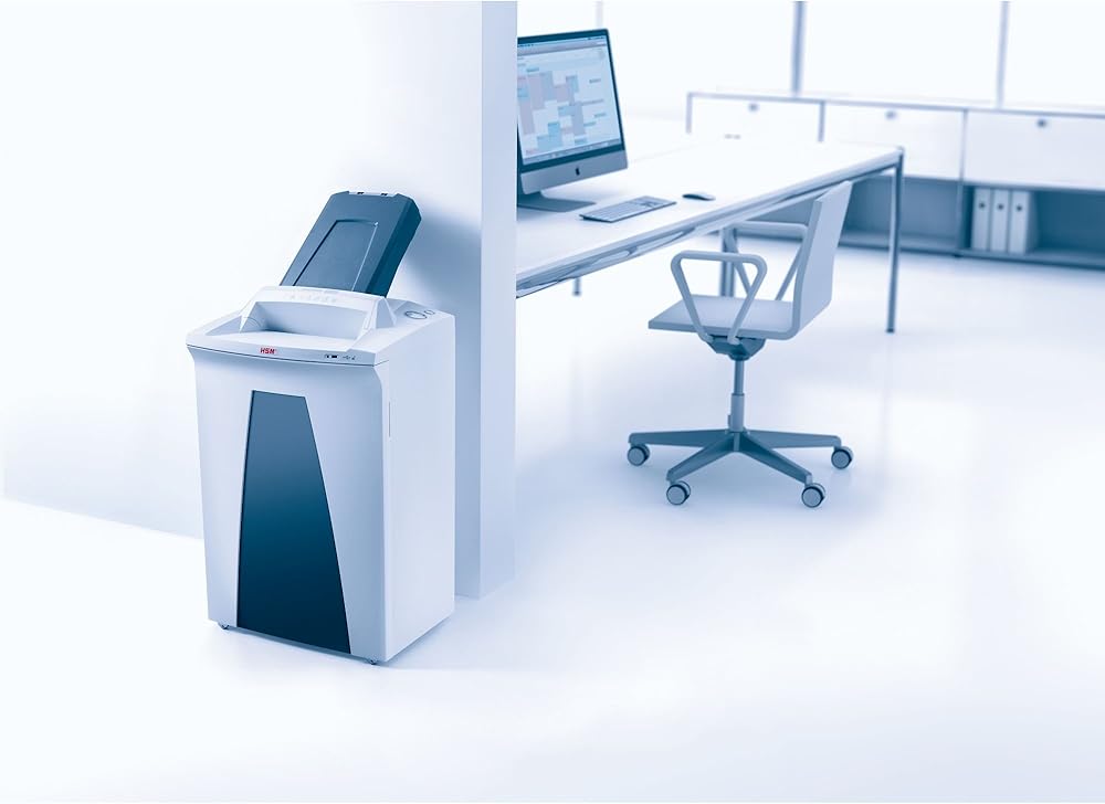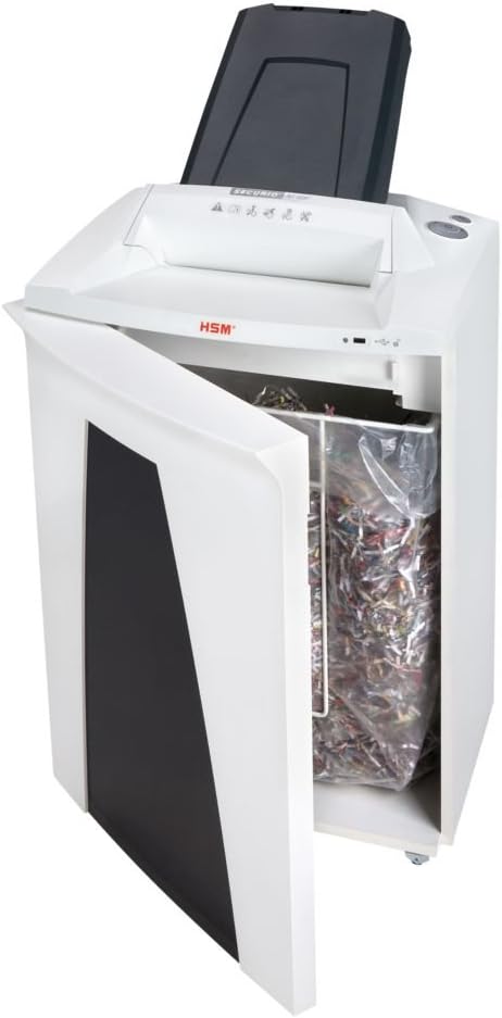 High quality materials and "Made in Germany" quality for security and durability complete with a 3 year warranty. Cutting rollers made of hardened solid steel. Reliable and time-saving shredding of stacks of paper. Lock-and-Go function protects the inserted paper stack against unauthorized access. Powerful motor allows for continuous operation. Nanogrip technology for reliable sheet intake. Useful dual function: Manual feed of paper during the autofeed stack processing. EcoSmart: Particularly low power consumption of 0.1 watts in standby mode. Dust emission tested by independent institute has proven safe & harmless. Automatic return eliminates paper jams. Quiet operation minimizes noise development in the workplace. Multifunction element for intuitive operation. Light barrier for automatic start / stop. Convenient and effortless removal and emptying of collection bag. High quality wooden floor cabinet with door. Level indicator through inspection window in the waste container. Mobile on castors.
