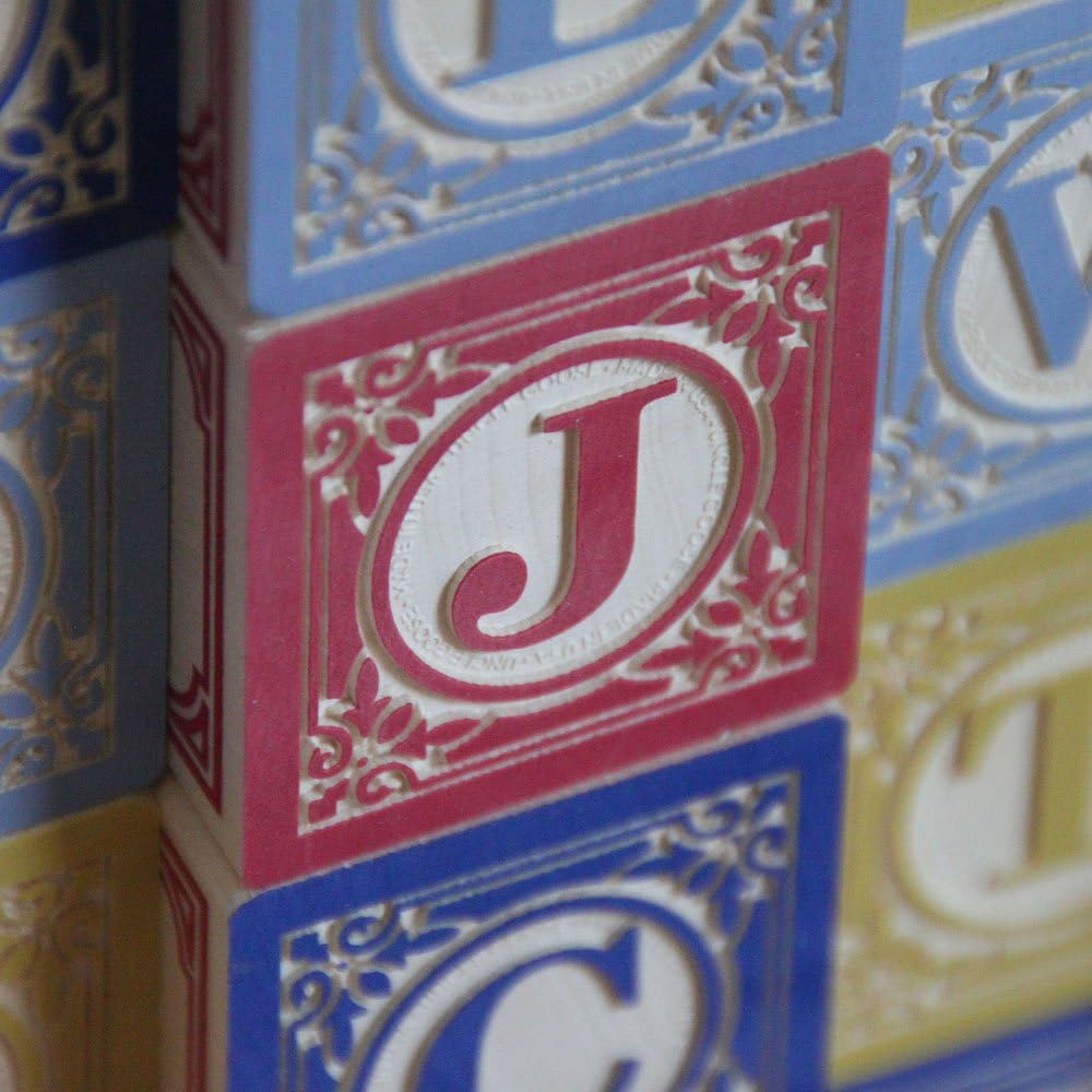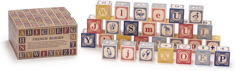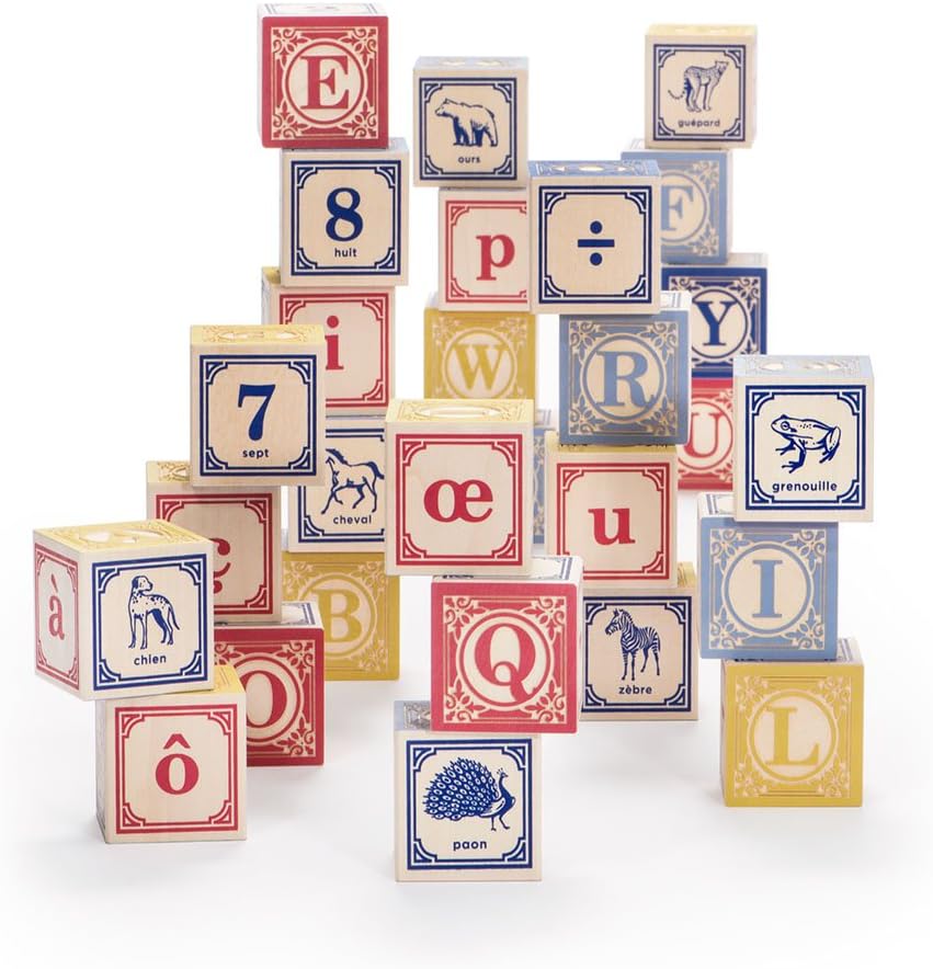 Expand your knowledge of the French language with this 28 block set. Enjoy the embossed fleur-de-lis filigree. This stylized detail surrounds two capital letters on opposing sides of each block. Two other sides show one number and one animal paired with their French translations. Two more handcrafted capital letters make four complete alphabets.