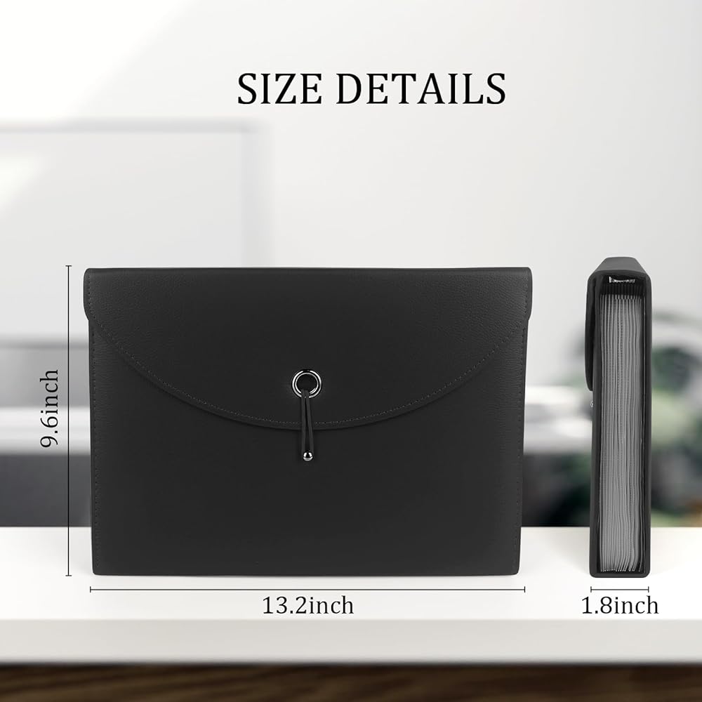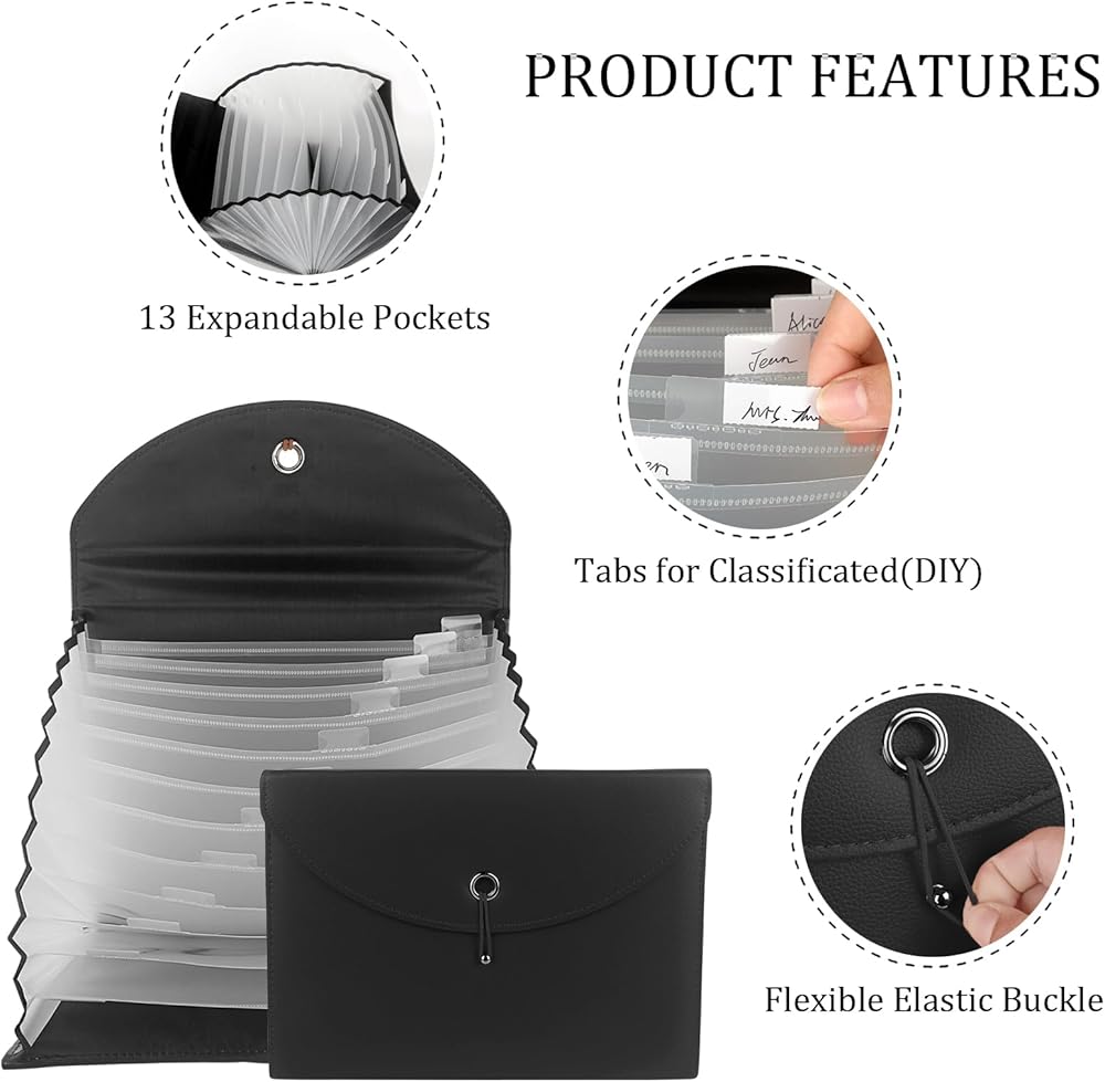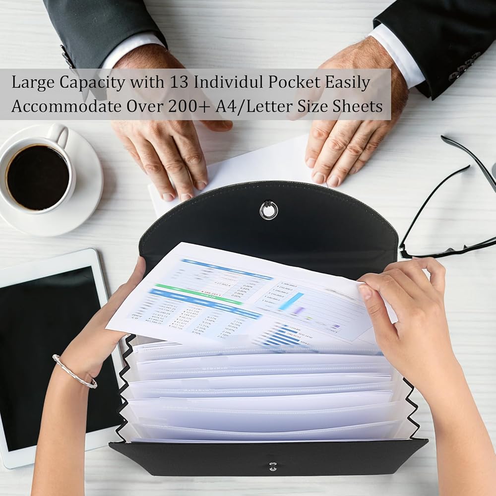 منظم ملفات الأعمال ذو سعة كبيرة: تصميم يحتوي على 13 جيبًا شفافًا، ويأتي مجلد الملفات الموسع مع بطاقات صغيرة لتصنيف الملفات وتنظيمها. مع إغلاق برباط خيط، مما يحافظ على ملفات المستندات آمنة من السقوط.