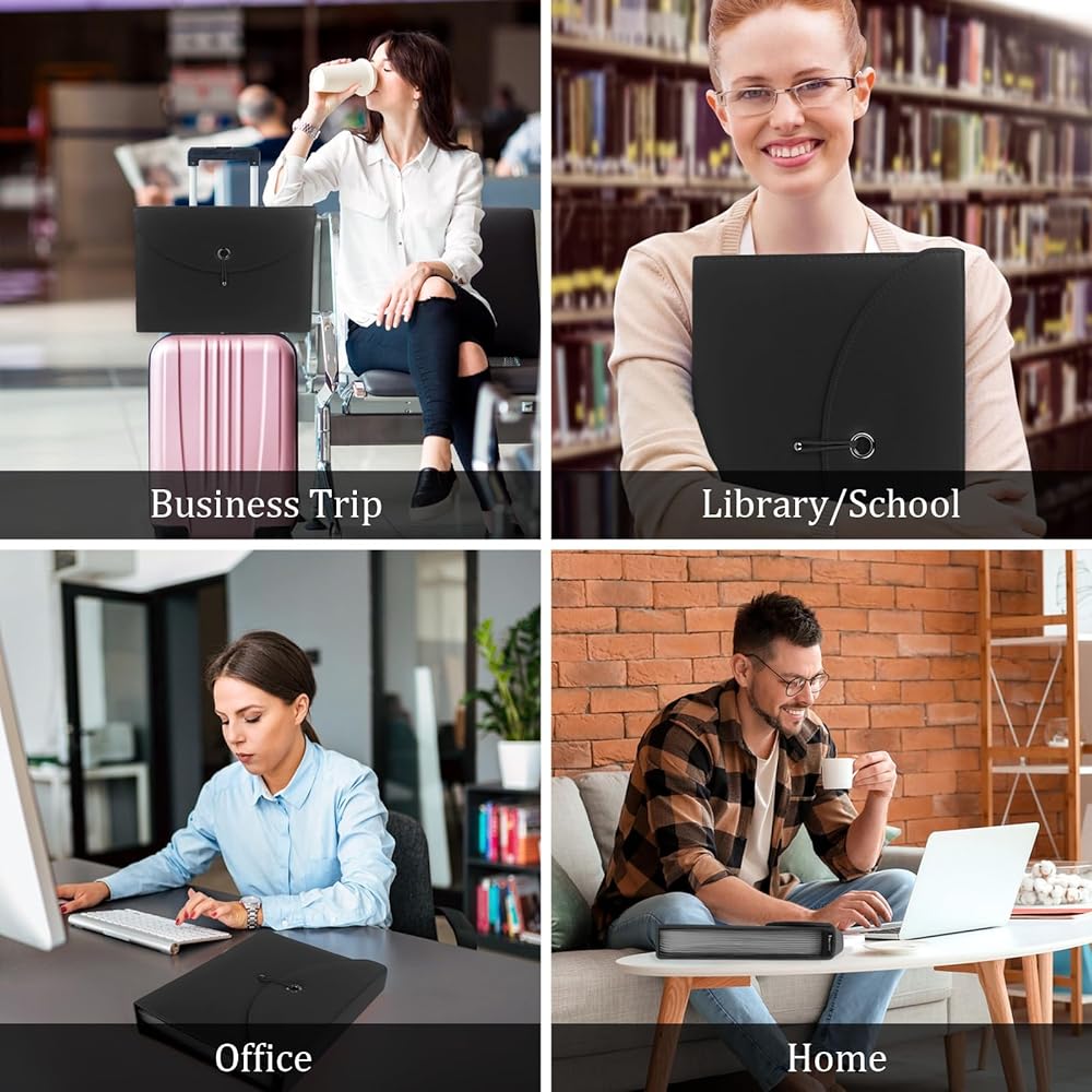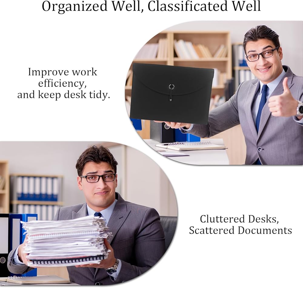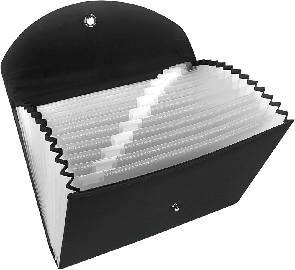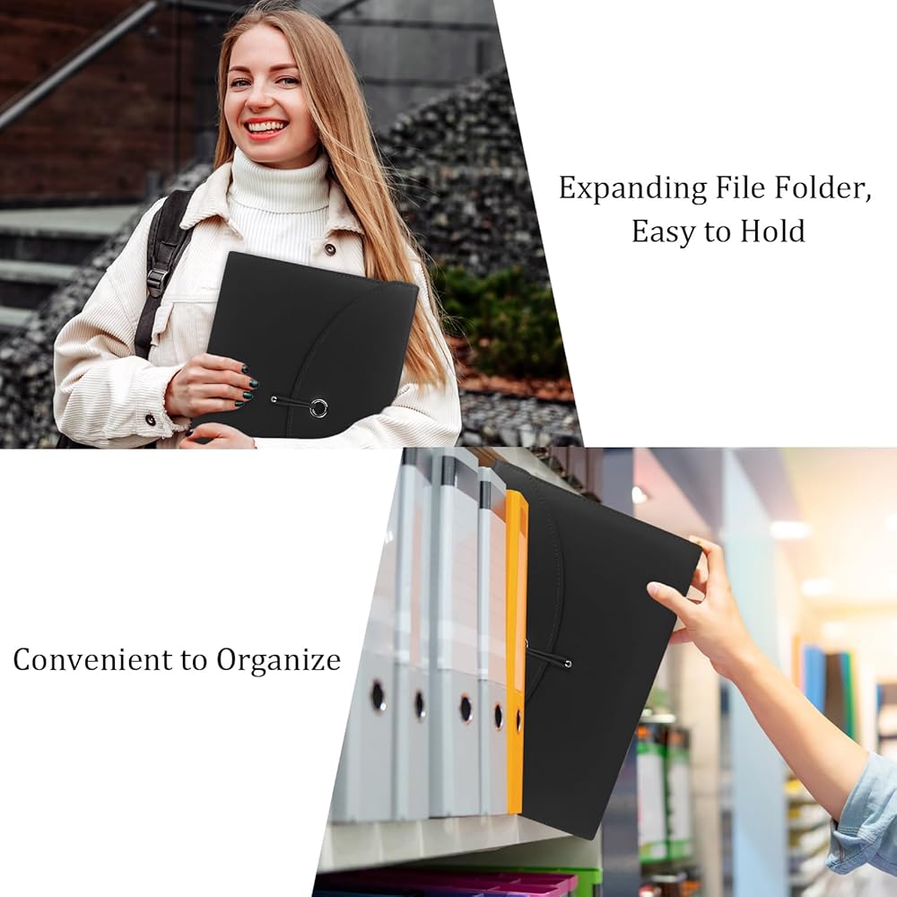 منظم ملفات الأعمال ذو سعة كبيرة: تصميم يحتوي على 13 جيبًا شفافًا، ويأتي مجلد الملفات الموسع مع بطاقات صغيرة لتصنيف الملفات وتنظيمها. مع إغلاق برباط خيط، مما يحافظ على ملفات المستندات آمنة من السقوط.