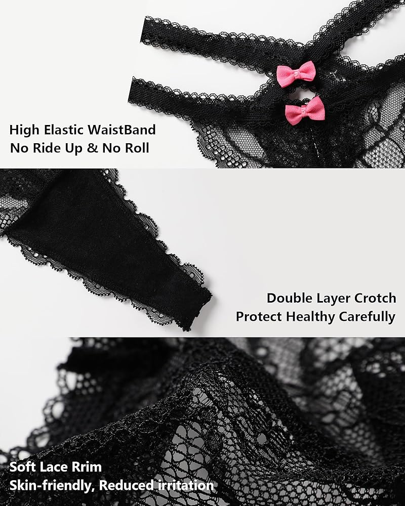 Sexy Lace Thong : Our Lace Thong for Women are designed to make you feel confident and sexy. The lace trim thong style adds a touch of allure, while the soft and breathable fabric ensures all-day comfort.the small bow decorations on the back add an extra touch of cuteness.
