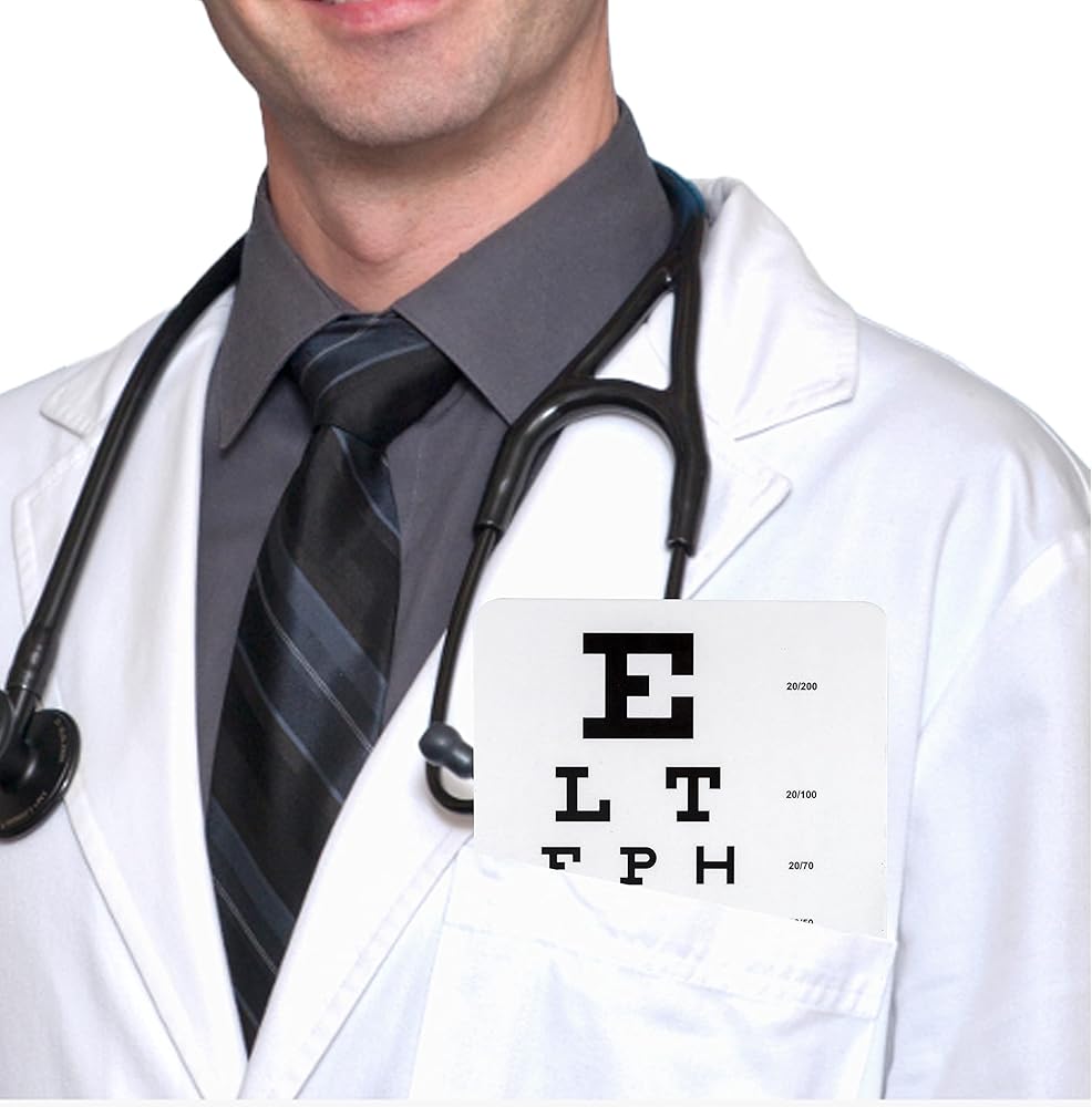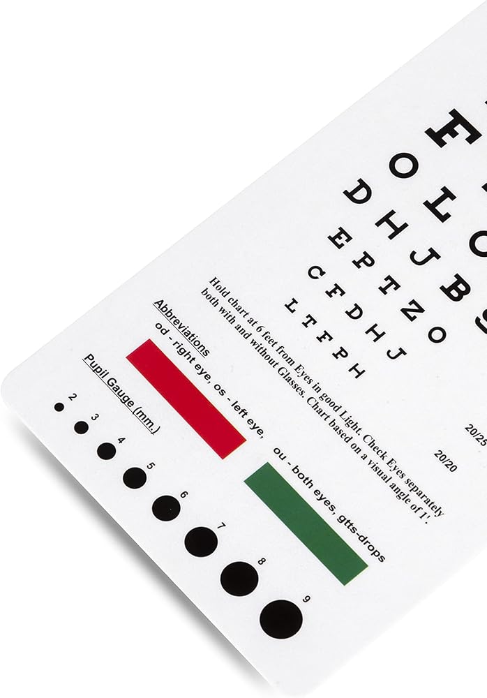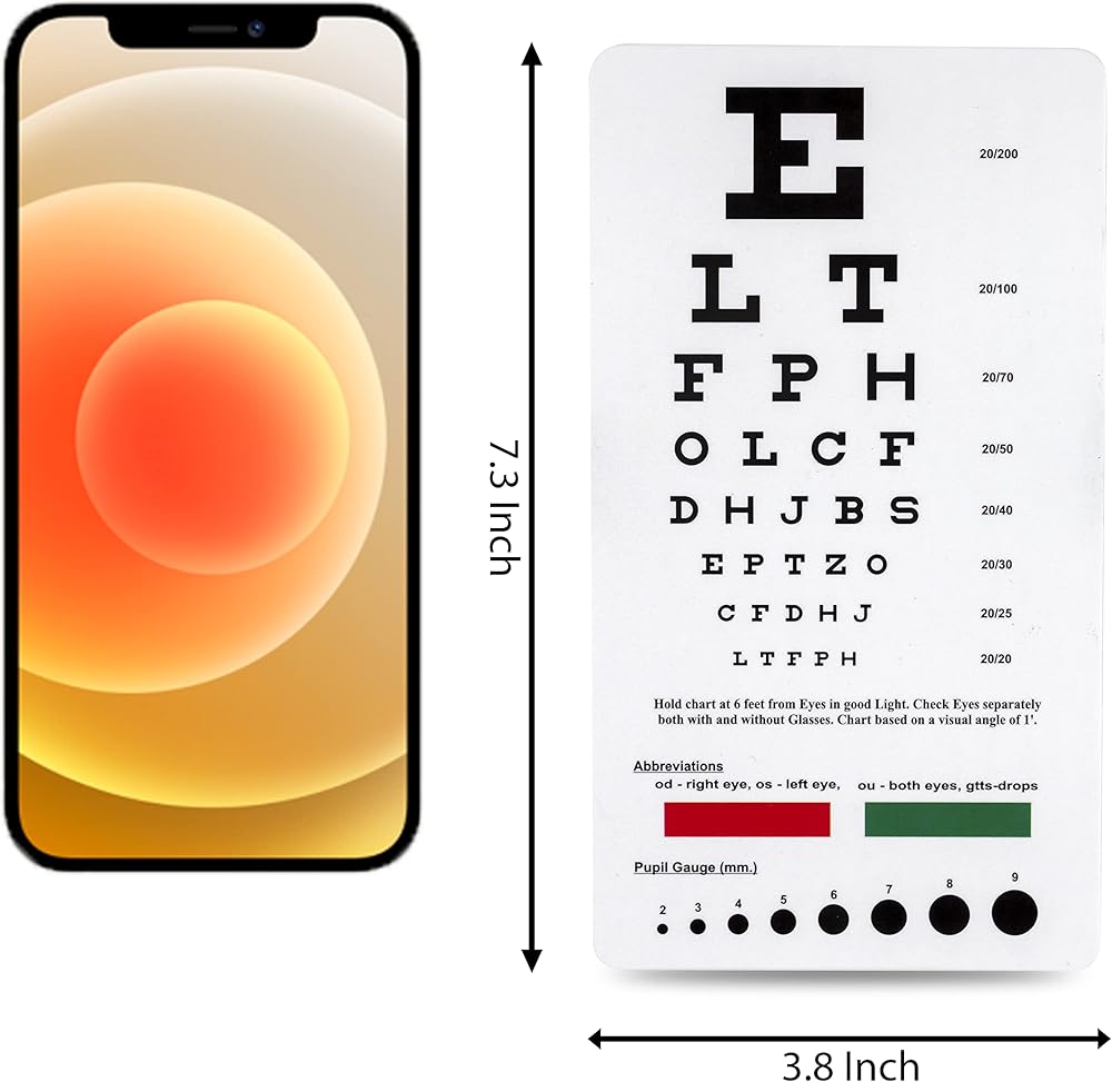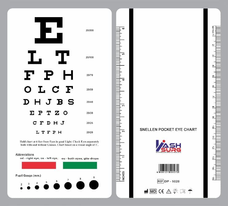 Handy pocket-sized eye chart. Easy clean plastic is sanitizable. Ruler on back with inches and centimeters.