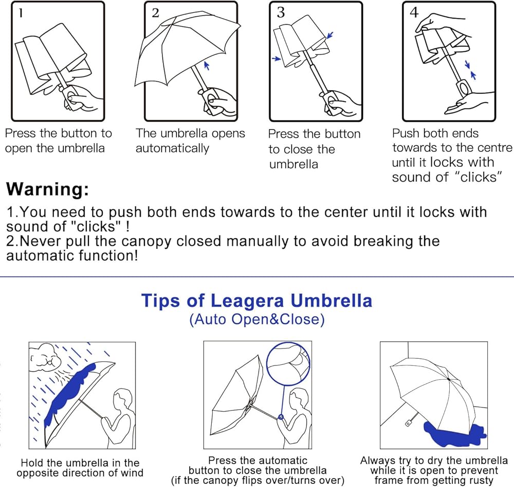 ☂ Warranty - If there is any quality problem with the auto open auto close umbrella within one year of purchase, you can contact Learea Team at any time, and will replace it for free.