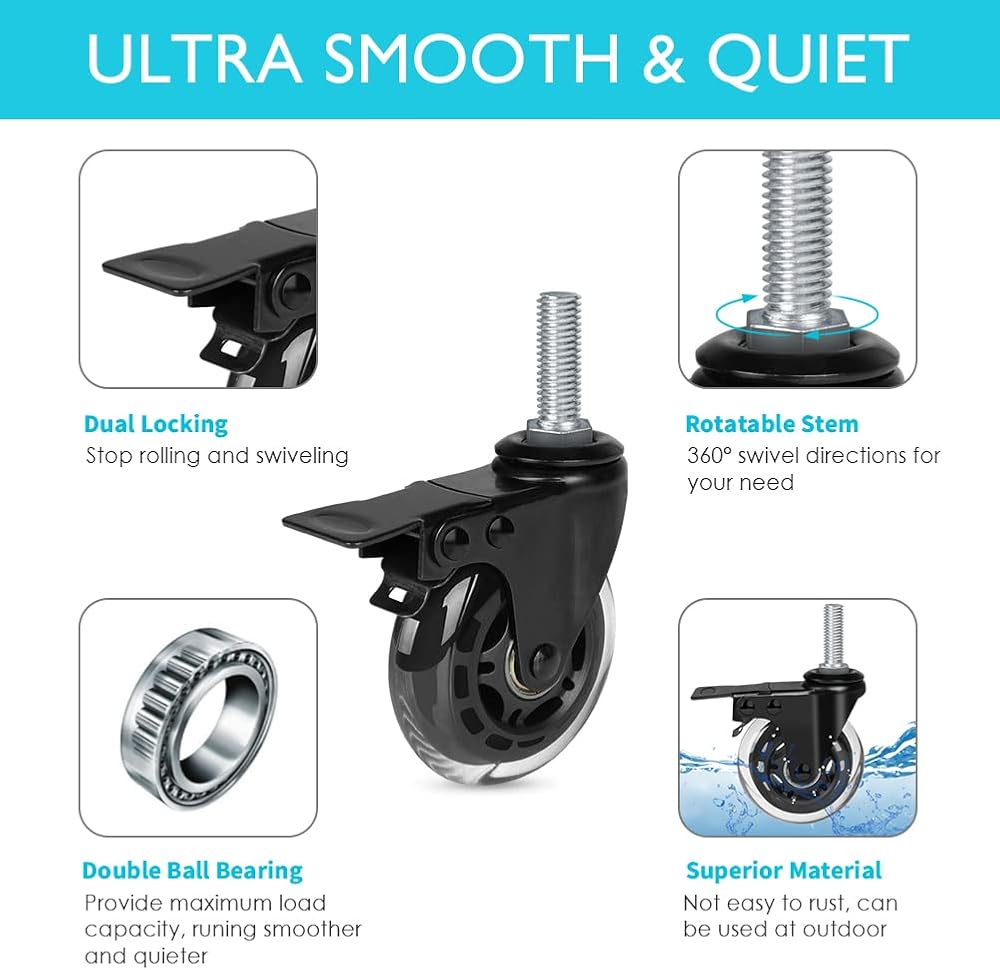 • قم بحماية أرضياتك: تتميز عجلتنا بطبقة مطاطية ناعمة من البولي يوريثين تجعلها تنزلق بسهولة على أي نوع من الأرضيات. إنها تمتص الصدمات والاهتزازات، وتحمي أرضياتك من الخدوش والعلامات.