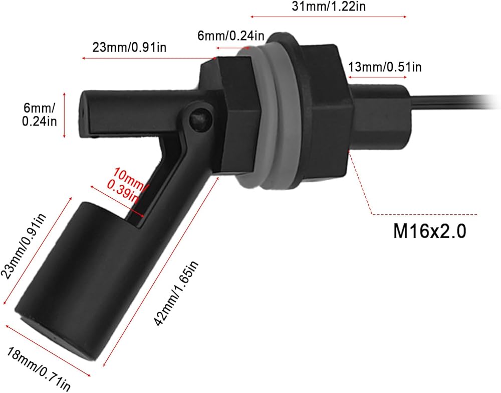 Thread Dia(Approx): M16 mm ; Thread Dia(Approx) : 1.55cm / 0.61" ; Float Ball Size(Approx) : 2.3 x 1.7cm /0.9" x 0.67" (L*D) ; Total Length : 84mm / 3.31" ; Cable Length: 40cm/15.8"