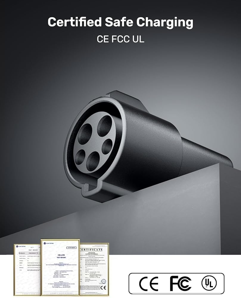 - معتمد من قبل CE وFCC، محول Zanch Tesla J1772 مصنوع من مادة مقاومة للحريق عالية الجودة مع جهاز كمبيوتر من الدرجة 94-V0 قذيفة. كما أنها تتمتع بتصنيف IP65 المقاوم للماء لضمان سلامة الشحن.