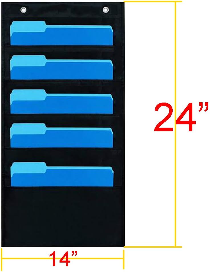 Include: 24" tall X 14"(35.5*61cm ) 5 pocket chart/hanging wall file in black. Note: Folders and various hooks displayed not included.