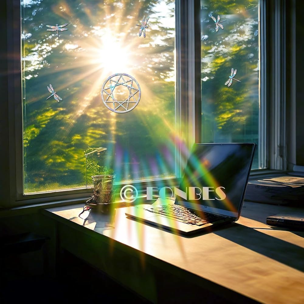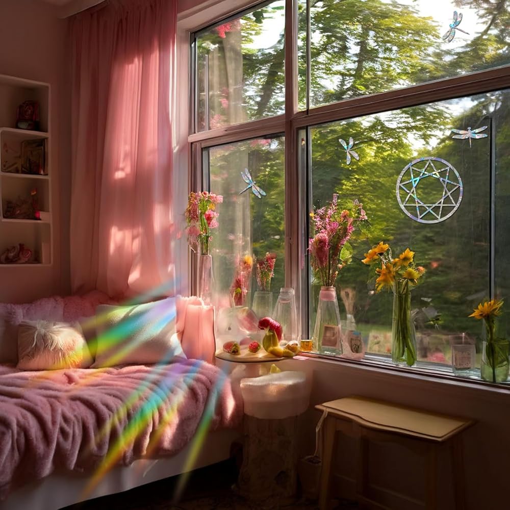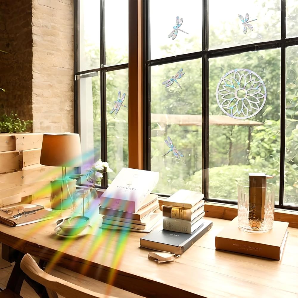 • Ideal for stopping birds from hitting windows. A pretty way to help the birds but also add details to your home. These stickers turn sunlight into beautiful rainbows to your room when the sun shines through them.