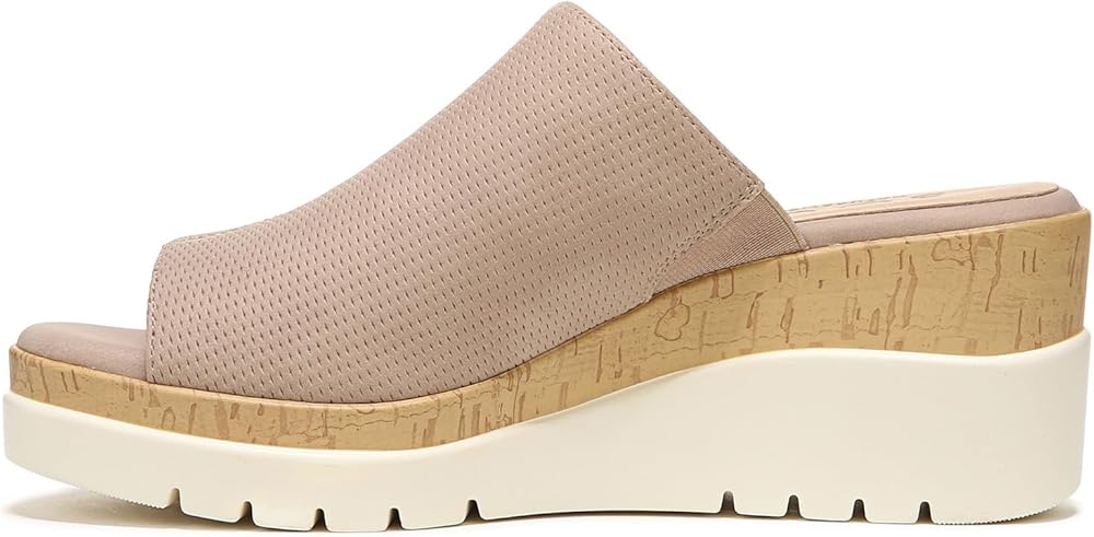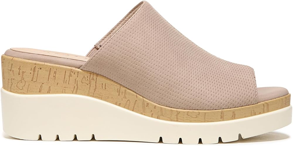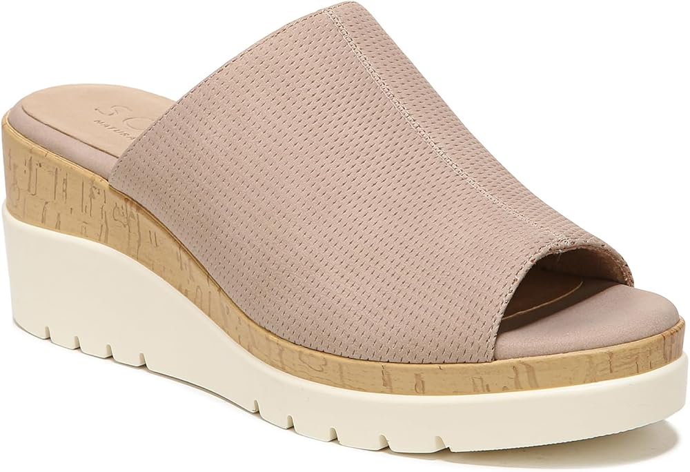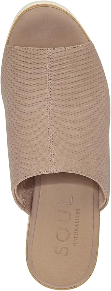 Slip on and go. A peep toe completes the look of this easy-going wedge sandal for women from SOUL Naturalizer. Elevated by a cork or woodgrain trim wedge and white lug bottom, it's a wear-everywhere style. Inspired by the way you live. Casual wedge sandal with cork accent. Manmade or metallic manmade upper with a peep toe. All-Thru Comfort: soft foam lining, arch support with memory foam, lightweight and flexible outsole. Lug sole. 3 inch(es) wedge heel. Consciously packaged: 100% of our shoe boxes are made of 80% recycled paper + soy-based ink. Designed using some environmentally preferred materials. WHY YOU'LL LOVE IT: Ingenious relaxed utility. Unstructured, uncomplicated styles thoughtfully designed with your comfort in mind so you can live in the moment. Available in an inclusive size range of tough-to-find sizes and widths for a better fit and feel including wide width shoes.