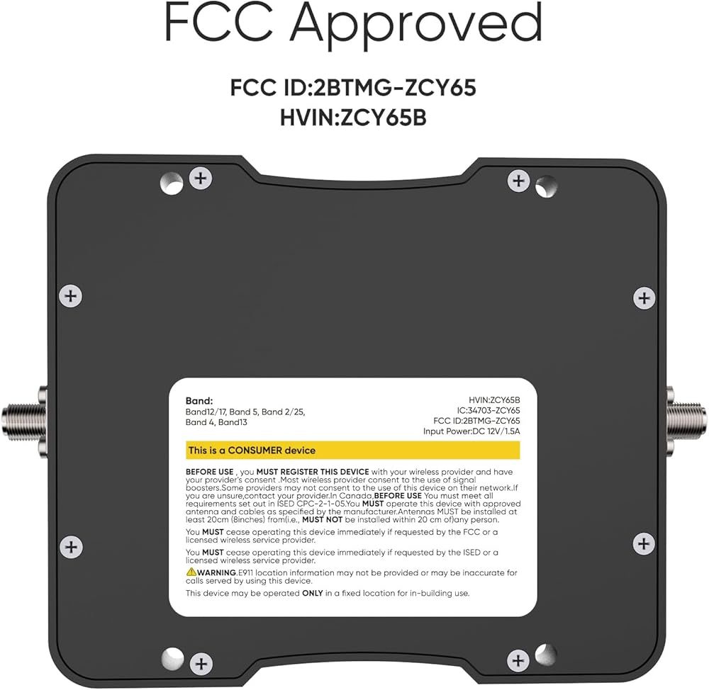 【FCC Approved】The booster is compliance with the requirements of the standards applied. FCC ID: A7V-SR15652001. Hardware Version Identification Number(HVIN): SR15652002A.