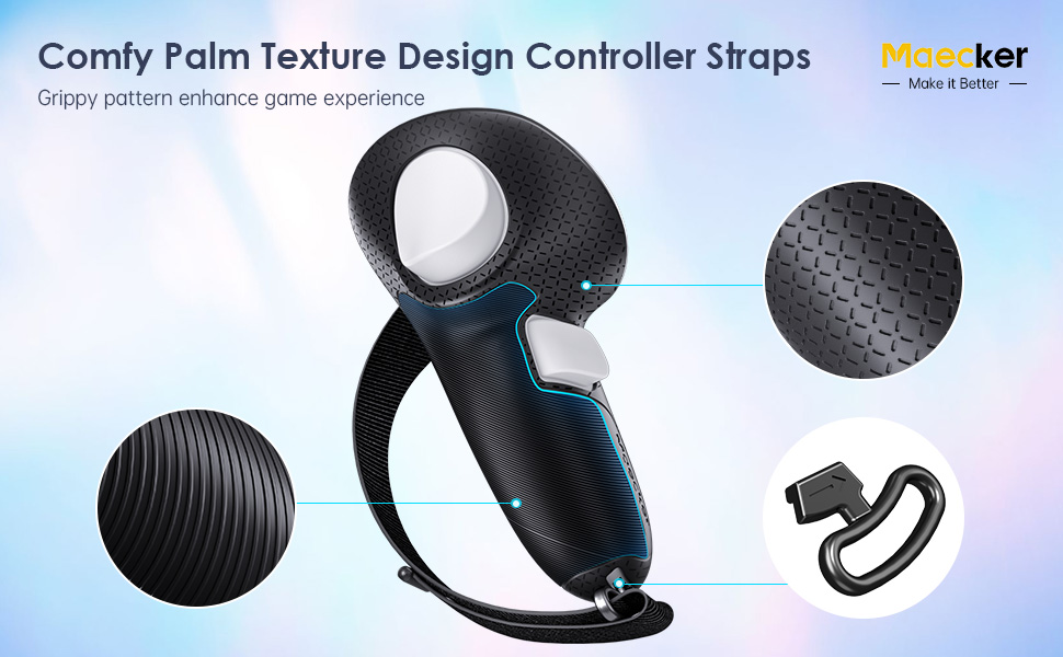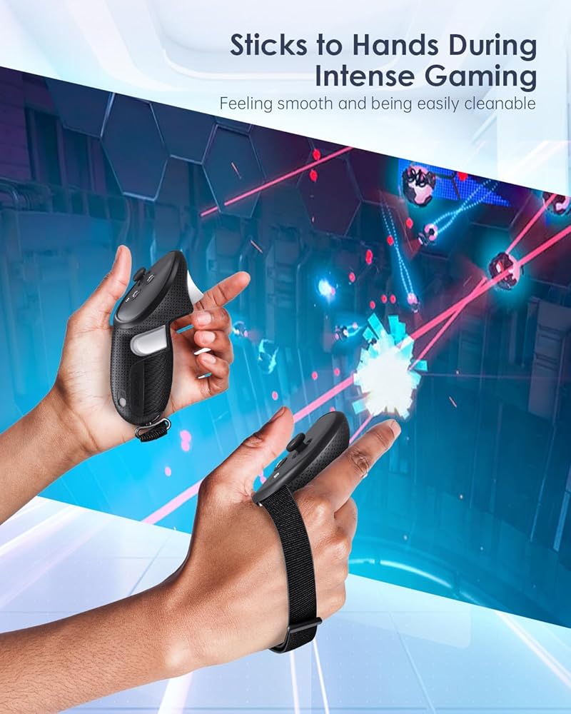 صلبة: أحزمة التحكم الخاصة بمقابض وحدة التحكم أوكيولوس كويست 3 مصنوعة من مادة سيليكون عالية الجودة، وتتميز بسطح معزز مضاد للانزلاق، مع مقابض وحدة التحكم هذه المتوافقة مع أحزمة بطارية كويست 3 التي لم تعد تتعرق بعد الآن، مما يمنحك راحة تدوم طويلاً. الإبزيم المعدني الموجود بالأسفل يجعل من الصعب سقوط وحدة التحكم وهو أكثر صلابة.