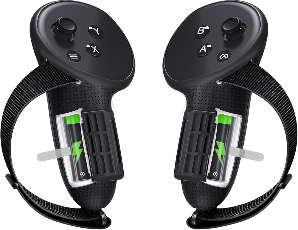 سهولة الوصول إلى البطاريات: يوفر التصميم المفتوح عند باب البطارية وصولاً سريعًا وسهلاً للغاية إلى البطاريات. عند استبدال البطارية، احتفظ بلسان سحب البطارية البلاستيكي أسفل البطارية. تم تصميم مقابض وحدة التحكم المتوافقة مع ملحقات Meta Quest 3 خصيصًا لـ Quest 3 ولن تمنع إشارة اللعبة.
