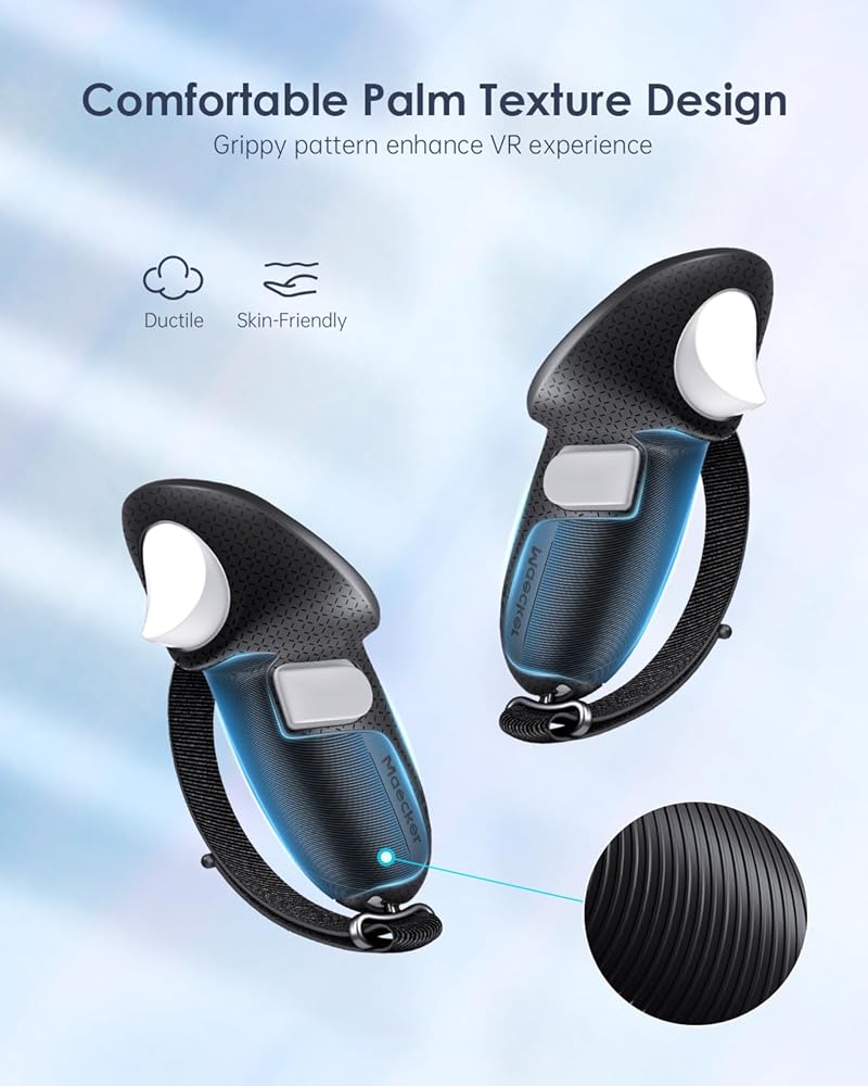 مقابض مريحة للغاية: تعتمد أحزمة التحكم الخاصة بمقابض التحكم Meta Quest 3 مبادئ مريحة وتتناسب مع نسيج راحة اليد. تتميز المواد المستخدمة في مقابض وحدة التحكم لأشرطة وحدة التحكم Quest 3 بملمس مرضي للغاية، وتشعر بسهولة بأنها طبيعية عند الاستخدام وتسمح لك بالاستمتاع بتجربة ألعاب غامرة.