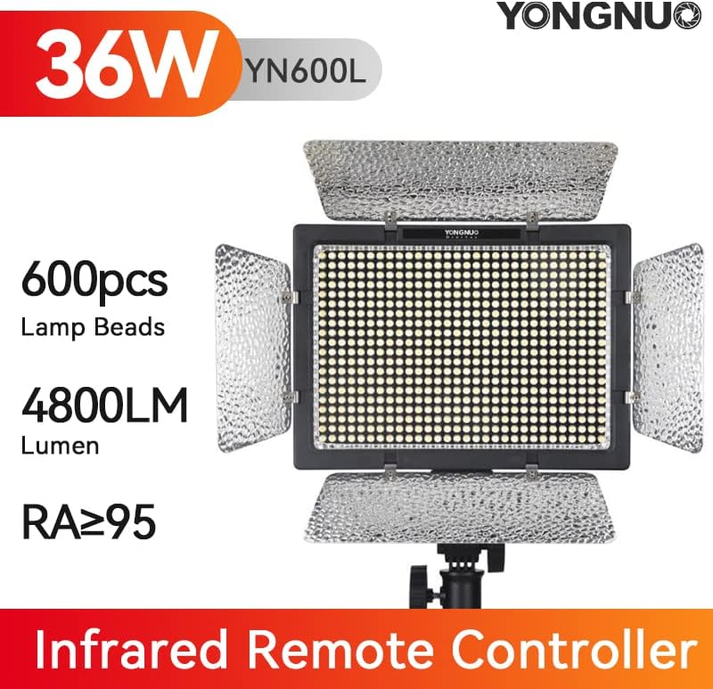 【CRI عالي، 600 قطعة من خرزات المصباح عالية الجودة】4680 لومن، طاقة 36 وات، CRI95+. يتكون مصباح الفيديو YN600L LED هذا من 300 قطعة 5600K و300 قطعة 3200-5600K خرزات مصباح عالية الجودة من رقائق مضيئة كبيرة جدًا.
