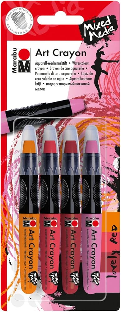 Marabu-Creative Art Crayon Set. A high pigment, water-soluble crayon with a smooth, soft consistency. The vivid, lightfast colors can be smoothly mixed for brightly colored blending and a water color appearance when combined with water. Ideal for producing backgrounds, wipe-stenciling and stamping as well as linking mixed media projects. Use on paper, canvas, wood and more. This 9-1/4x3- 1/2x3/4 inch package contains four art crayons in assorted colors. Conforms to ASTM D 4236. Comes in a variety of colors. Each sold separately. Imported.