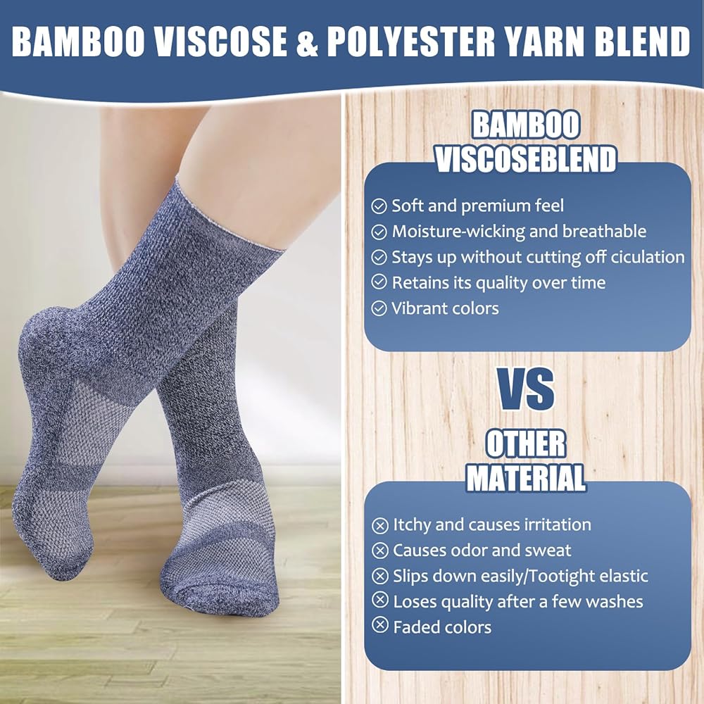 • جوارب صحية لمرضى السكري - جواربنا للنساء والرجال تمت حياكتها من ألياف الفسكوز (49% فيسكوز، 49% بوليستر، 2% ألياف لدنة). مصنوعة من خلال إضافة البوليستر إلى فسكوز الخيزران، مما يجعل الجوارب المخيطة تتمتع بمزايا امتصاص الرطوبة والعرق. امتصاص وتهوية وإزالة الروائح الكريهة، مرونة جيدة ومتانة. بالمقارنة مع الجوارب المصنوعة من القطن أو البوليستر الخالص، توفر هذه الجوارب بيئة قدم جافة ومنعشة، وهي أكثر ملاءمة لمرضى السكري.