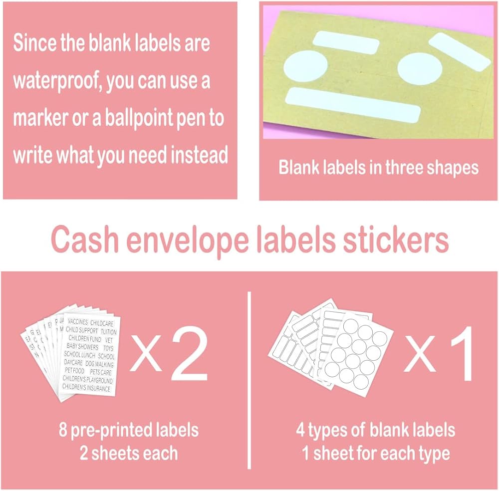 مادة ملصق الفينيل الموثوقة: ملصقات المغلف النقدي الخاصة بحافظة توفير المال مطبوعة مسبقًا على فينيل مقاوم للماء مع دعامة ذاتية اللصق تقاوم التقشير والتمزق. ما عليك سوى إزالة الملصق الموجود على محفظتك النقدية أو استبداله حسب الحاجة. الملصقات سهلة الاستخدام وتدوم طويلاً، بما أن الملصقات الفارغة مقاومة للماء، يمكنك استخدام قلم تحديد أو قلم حبر جاف لكتابة ما تحتاجه بدلاً من الأقلام المائية وأقلام النافورة.
