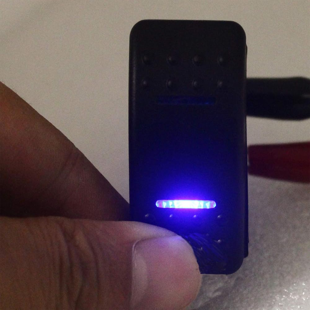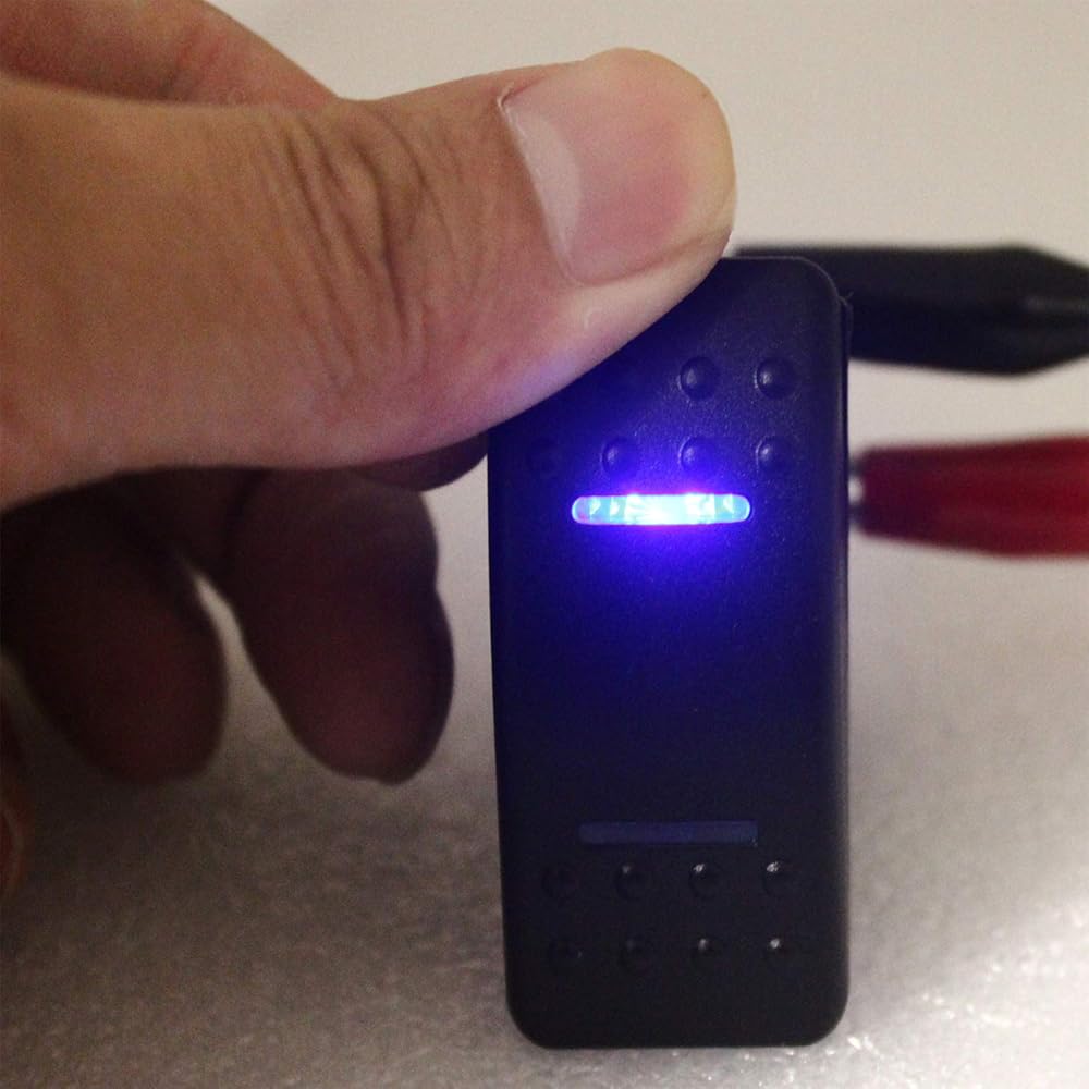 Same size as the ARB/Carling/NARVA switches. (it has a face surface size of 50mm x 25mm and uses a standard din size mounting hole of 37.2 mm x 21.2 mm.Please check the size before you bid.) Waterproof IP 68,Double Pole Double Throw Momentory ON-OFF-Momentory on switch,black hard surface rocker.Rated at 20amp/12v and 10amp/24v. Short circuit protection, overload protection, against polarity reversal protection. Dual LED lights in BLUE. Up light is ON when the switch is pressed UP.It will return off position when you remove your fingers. Down light is on when you press the switch down.It will return off position when you remove your fingers.(two premium LEDs emits cozy beam, you can see it clearly in the dark.) Suitable for Car,Boat,Marine,Yacht,RV,ATV,UTV.