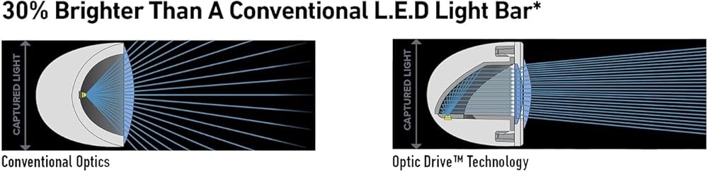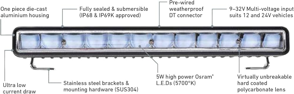 Featuring ‘Optic DriveTM' technology which captures and focuses more of the light generated to produce an extra-penetrating light output and eliminate waste, resulting in a 30% brighter output compared to a conventional LED light bar of the same length. Light bar contains Osram high power LEDs in a one-piece die-cast aluminum housing with 580mm pre-wired lead, genuine Nitto breather vent and weatherproof DT connector.