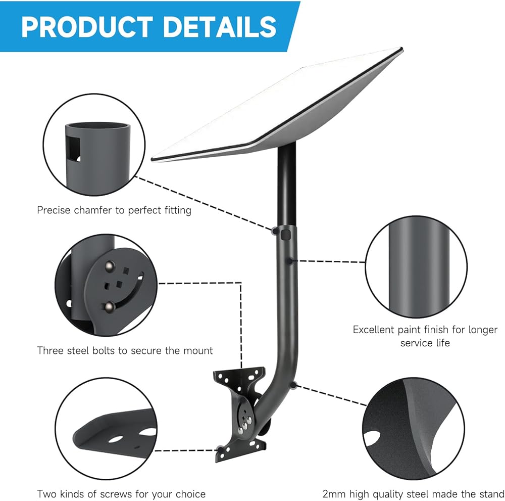 مادة متينة: قاعدة مجموعة تركيب ستارلينك مصنوعة من الفولاذ 2 مم، ويضمن الختم لمرة واحدة قوة عالية، والأنبوب مصنوع من الفولاذ 1.5 مم، وجميع البراغي مصنوعة من الفولاذ المقاوم للصدأ، وتمت معالجة حامل الهوائي بالكامل بمادة متينة. عملية طلاء مسحوق لموادها. وبالنظر إلى موقع تركيب المنتج، فإنه يضمن عمرًا طويلًا حتى عند وضعه في الخارج لفترة طويلة.